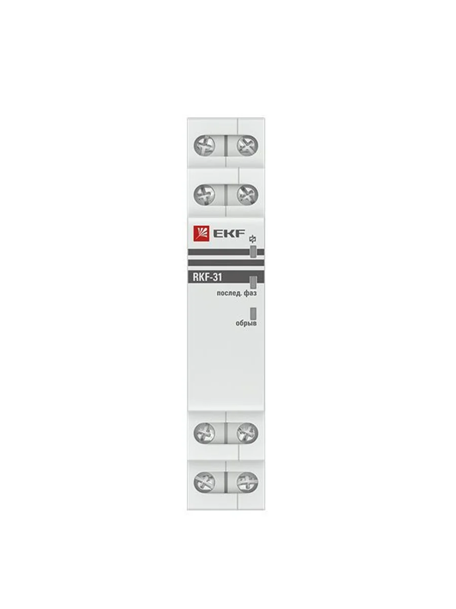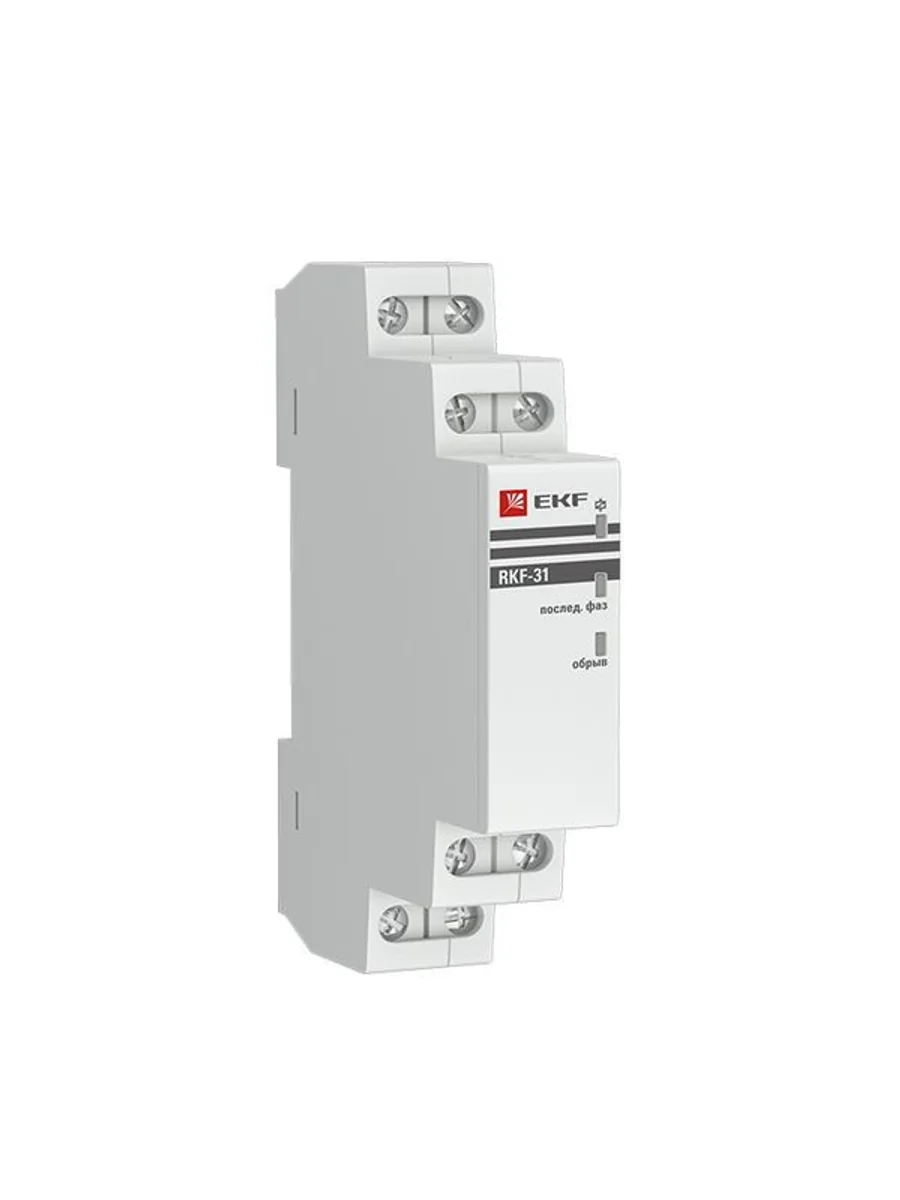 Реле контроля фаз RKF является механическими коммутационным аппаратом, который предназначается для контроля уровня напряжения в трехфазных сетях переменного тока и защитного отключения нагрузки в случае падения или повышения напряжения электрической сети сверх допустимого значения, а также в случае обрыва фазы, неверной последовательности фаз и асимметрии. Данные реле отличаются компактными размерами и универсальностью применения в трех- и четырехпроводных схемах. Реле контролирует следующие параметры: отсутствие фаз, чередование фаз.