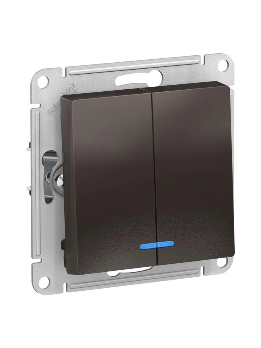 Механизм Systeme Electric (ранее Schneider Electric) серии AtlasDesign в цвете мокко выключателя 2-клавишного c подсветкой подходит для сетей 250 В, на ток 10 А. Благодаря светодиодной подсветке синего цвета изделие легко найти в темноте. Двухклавишный выключатель позволяет управлять двумя источниками света с одной точки. Лицевые детали из качественного ABS-пластика, устойчивого к царапинам и УФ-излучению.