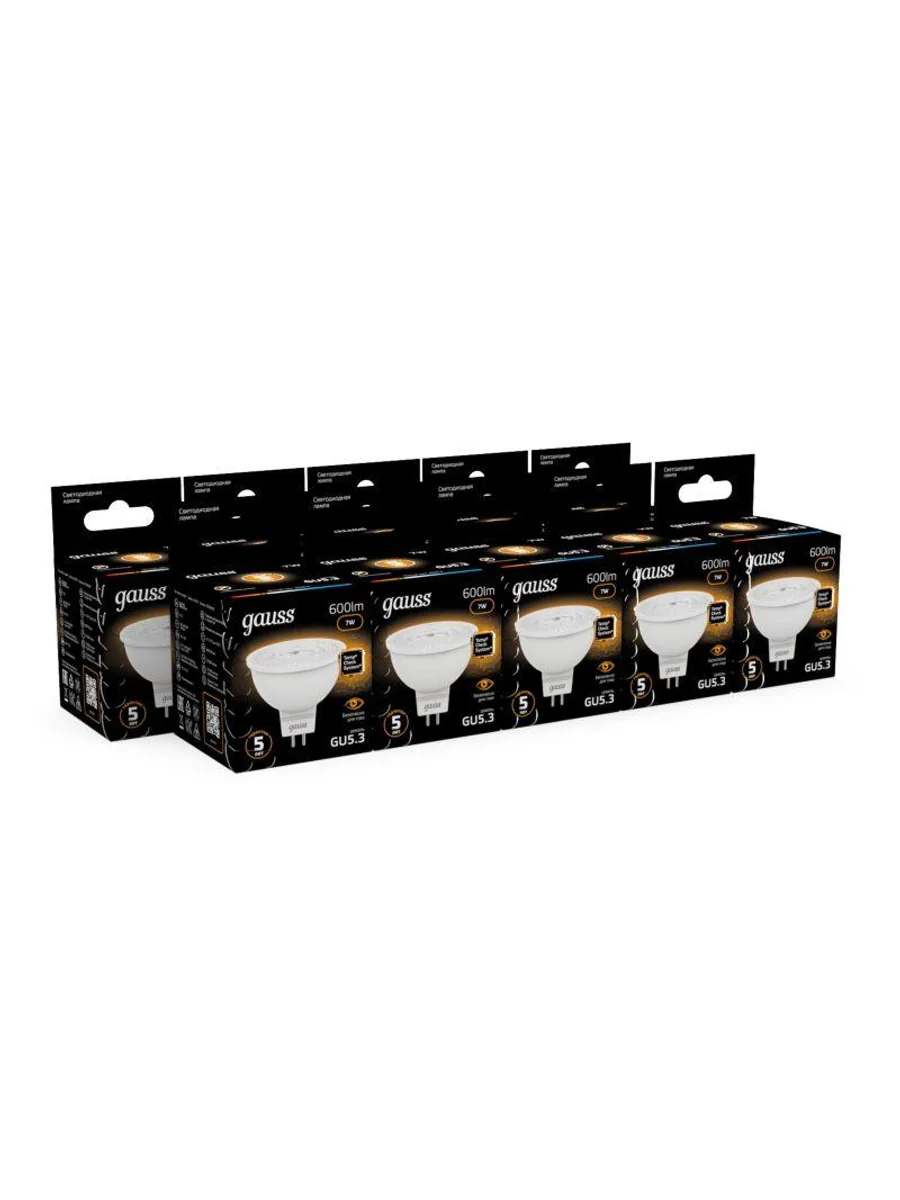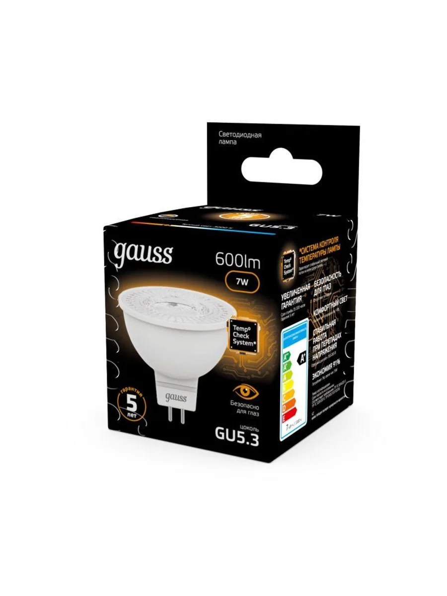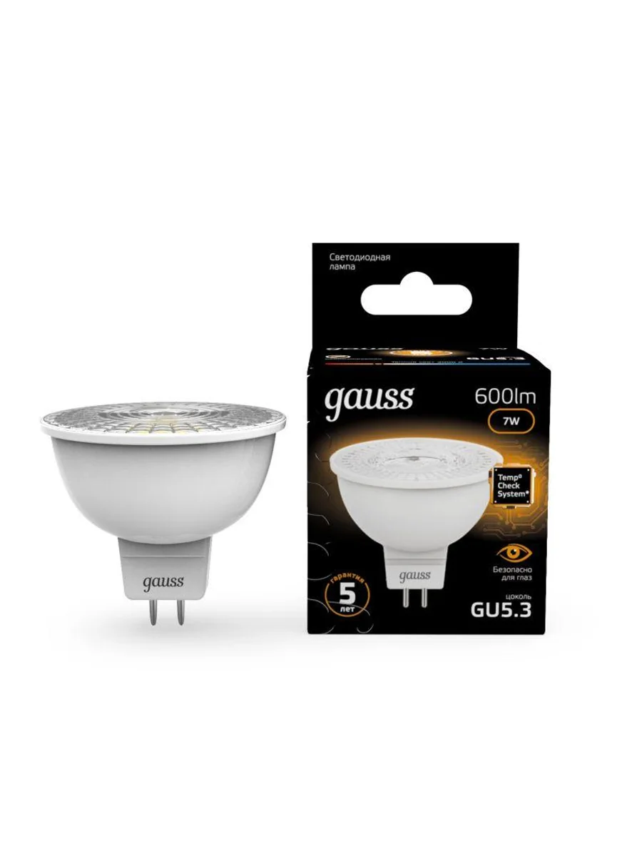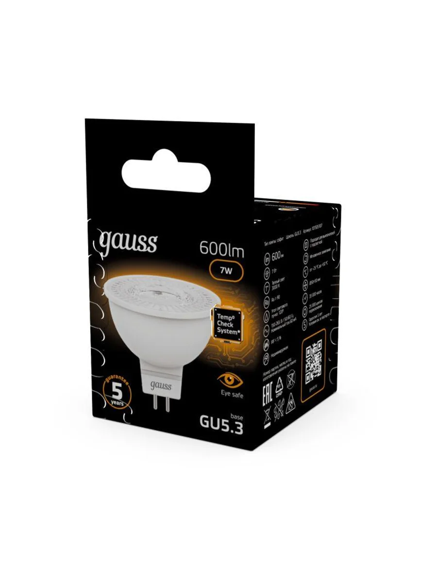 Лампа светодиодная LED MR16 7Вт GU5.3 2700К Gauss 101505107 – лампа-рефлектор, желтого света, диаметром 50 мм, с цоколем GU5.3, мощностью 7 Вт. Цветовая температура 2700 К.