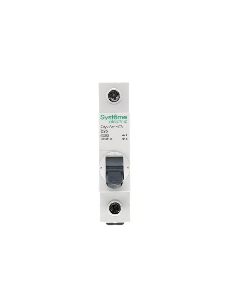 Автоматический выключатель серии City9 Set Systeme Electric, 1-полюсный, номинальный ток 25 А, характеристика С, Icn = 4.5 кА. Применяется в электрических сетях напряжением 230 В. Предназначен для защиты от перегрузок и токов короткого замыкания. Оснащен механизмом «мгновенной коммутации». Ударопрочный корпус из специального пластика с 6 металлическими заклепками. Безопасные клеммы исключают попадание кабелей в заклеммное пространство (ранее Schneider Electric EZ9F34125).