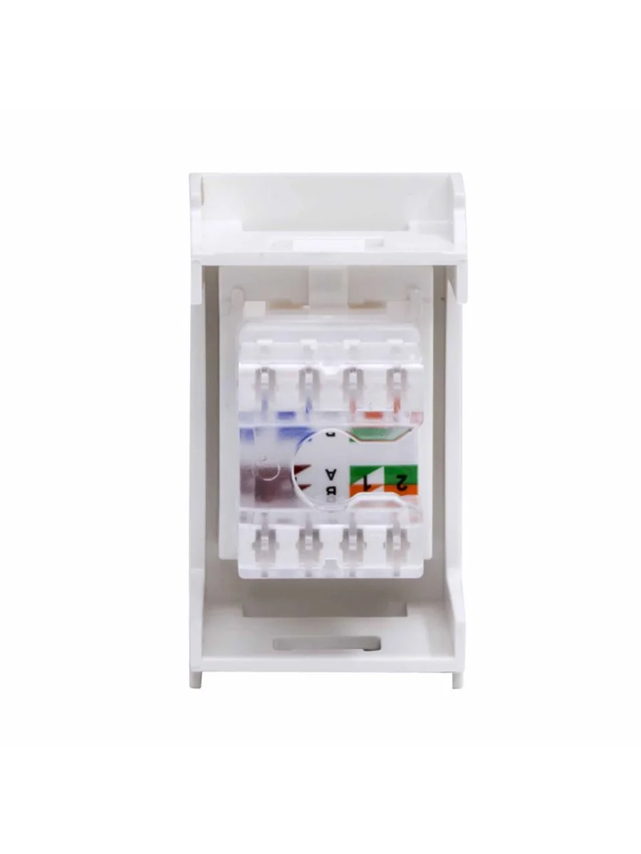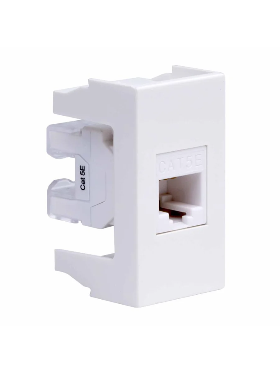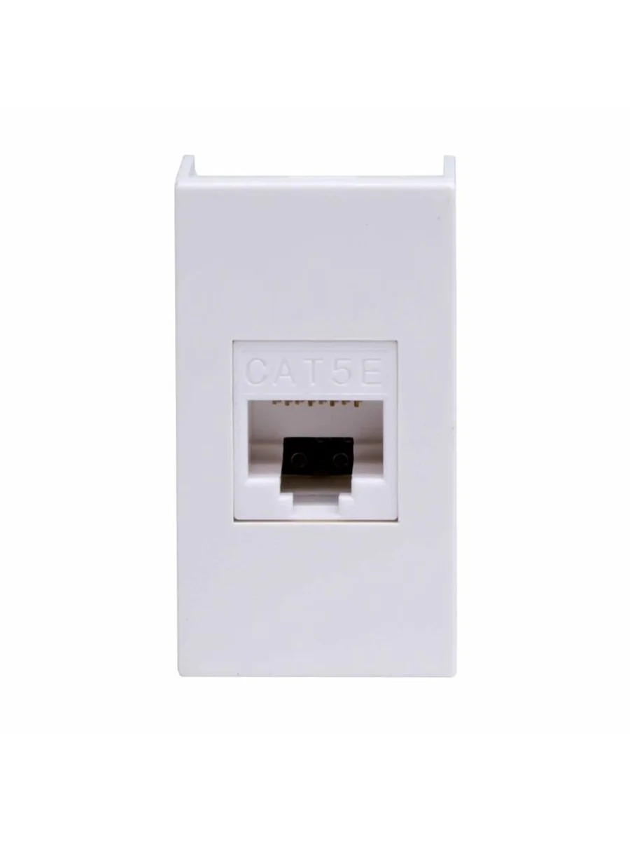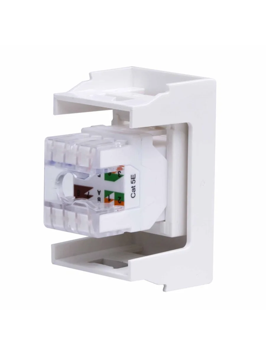 Компьютерная розетка. Назначение: подсоединение кабеля к компьютеру, принтеру и прочей оргтехнике. Характеристики: 8Р8С; комплектуются одномодульным гнездом; для заделки контактов в розетки использовать инструмент типа 110. RJ-45. Категория: 5е. Тип гнезда: Keystone. Производитель гнезда: Hyperline. Установочный размер: 45х25. Кол-во модулей: 1. Цвет: белый