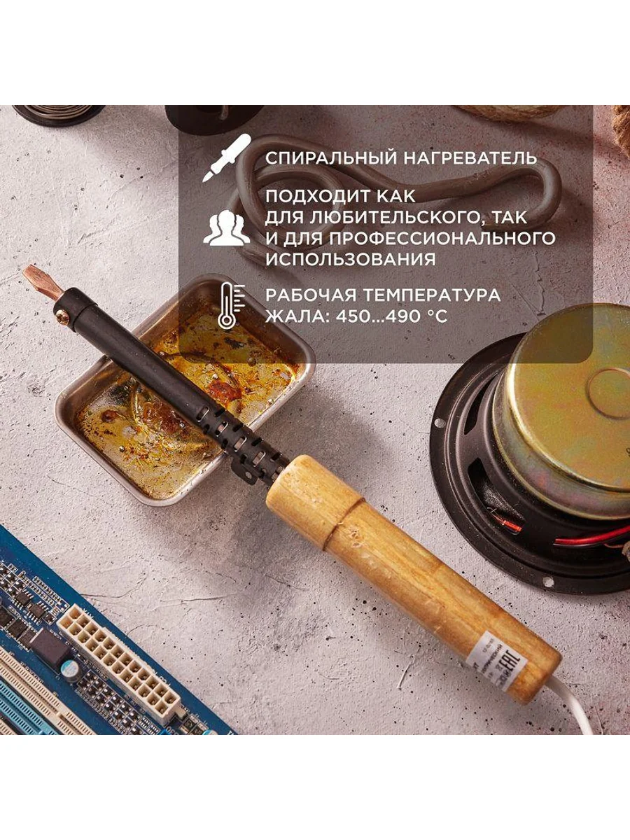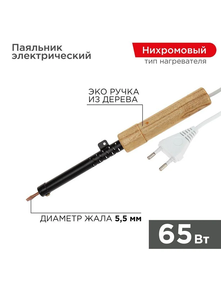 Паяльник с деревянной ручкой серии ЭПСН мощностью 65Вт REXANT предназначен для ручного монтажа/демонтажа электронных компонентов и других деталей среднего размера. Подходит как для любительского, так и для профессионального использования. Медное жало выполнено в форме клина (лопатки), в случае необходимости его можно легко и быстро заменить. Сменное жало в комплект не входит. Удобная эргономичная рукоятка выполнена из экологически чистого материала - дерева, что сделает работу с инструментом легкой и приятной.