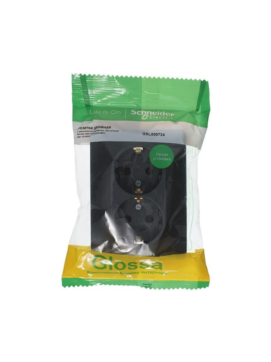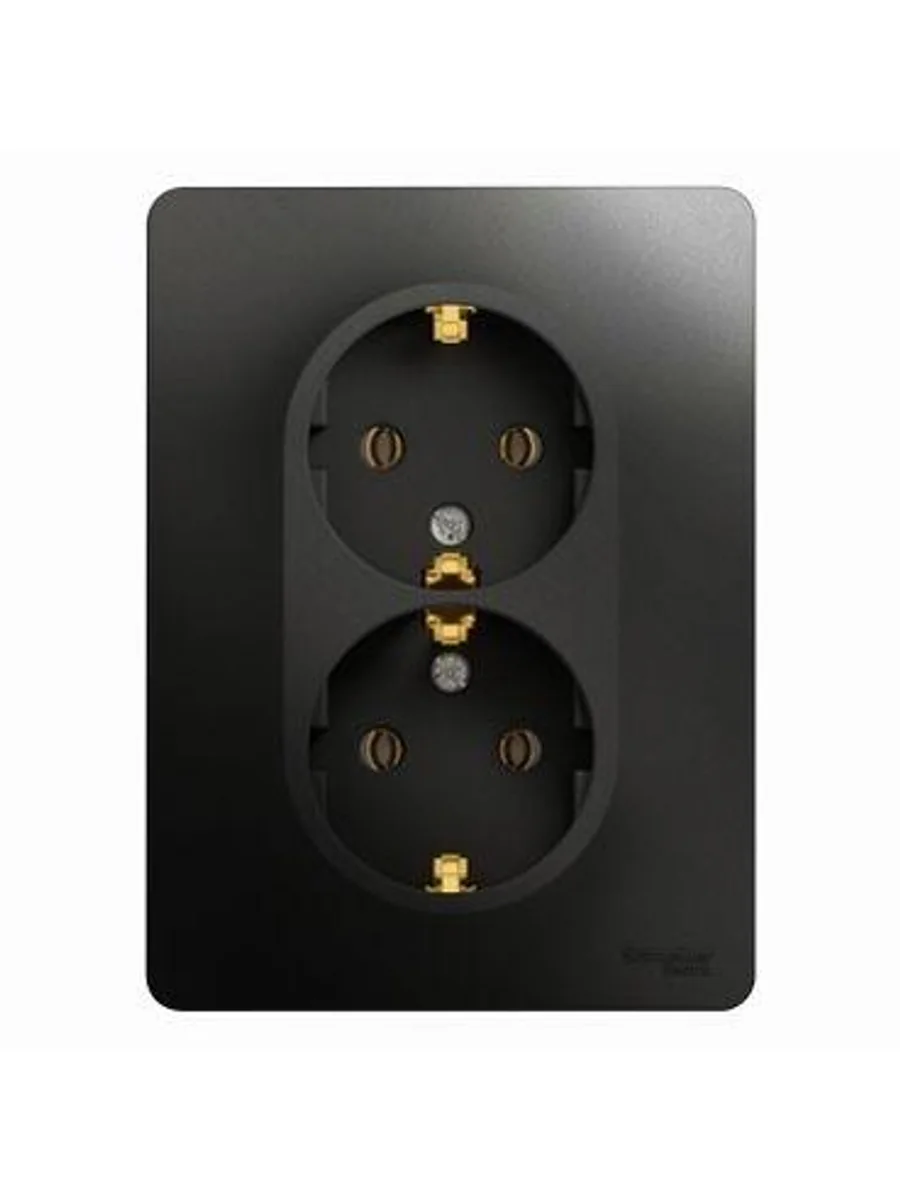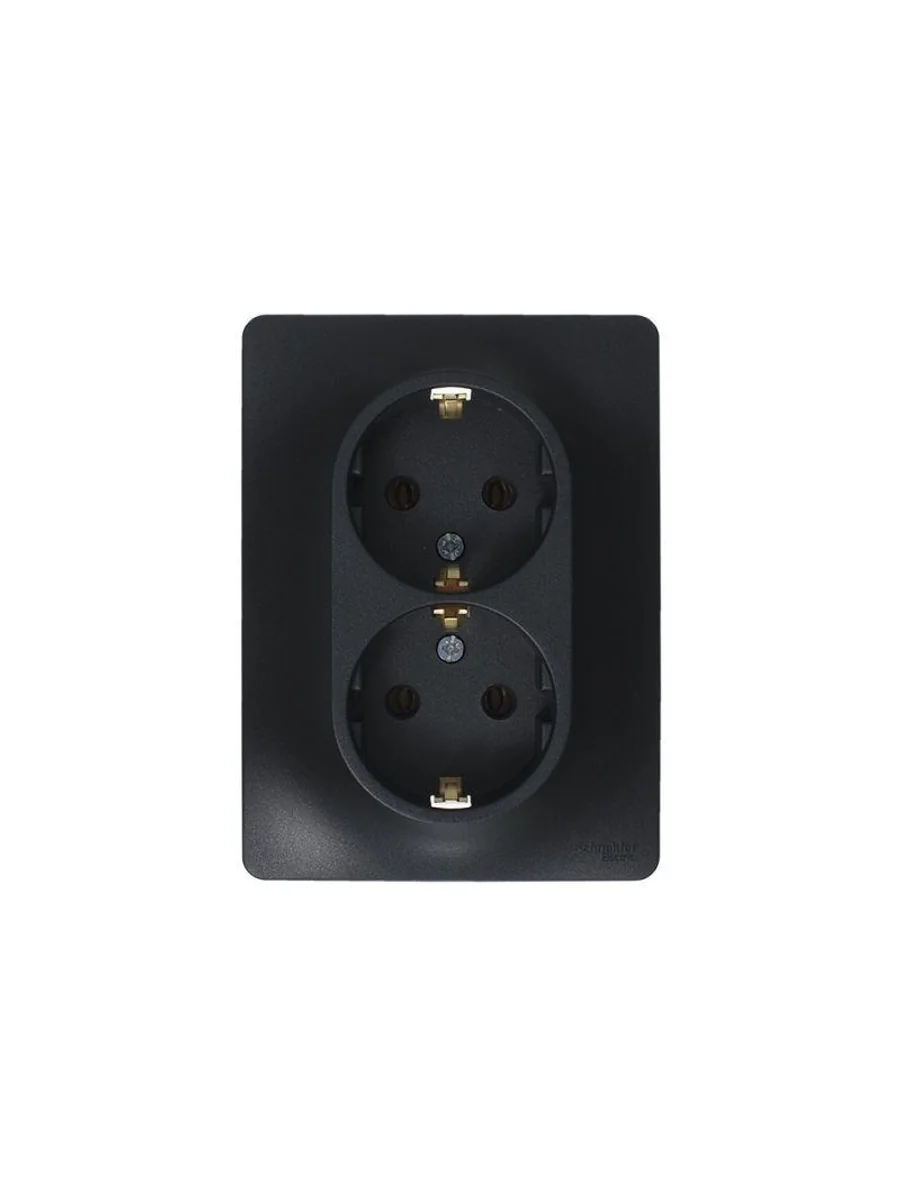Розетка двойная Systeme Electric (ранее Schneider Electric) серии Glossa (в сборе, цвет антрацит) с заземлением, без шторок подходит для сетей 250 В, на ток 16 А. - Заземляющий контакт обеспечивает дополнительную защиту от удара электрическим током. При наличии заземления электрический потенциал уходит в землю, защищая человека. - Выполнен из материала PС+ASA, стойкого к УФ-излучению и появлению царапин. - Двойная розетка позволяет подключить два устройства в одном месте.