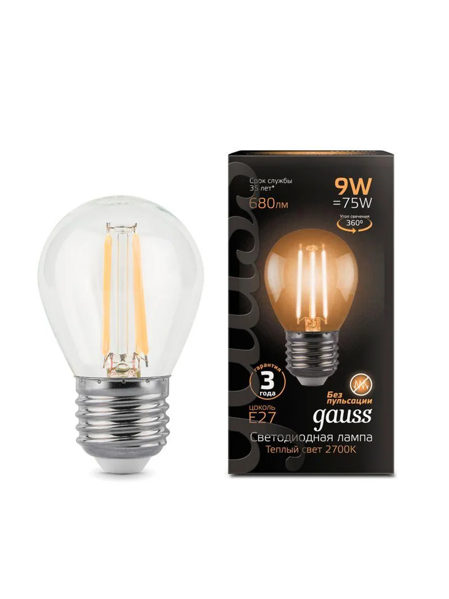 Светодиодные филаментные лампы GAUSS - это новейшие технологии в светотехнике. Лампы имеют привычный вид классических ламп накаливания, освещают пространство на 360о и дают больше света по сравнению с обычными светодиодными лампами за счет прозрачной колбы. Идеально подходят для хрустальных люстр и открытых светильников, а также для реализации дизайнерских решений, где важен вид классических ламп накаливания.