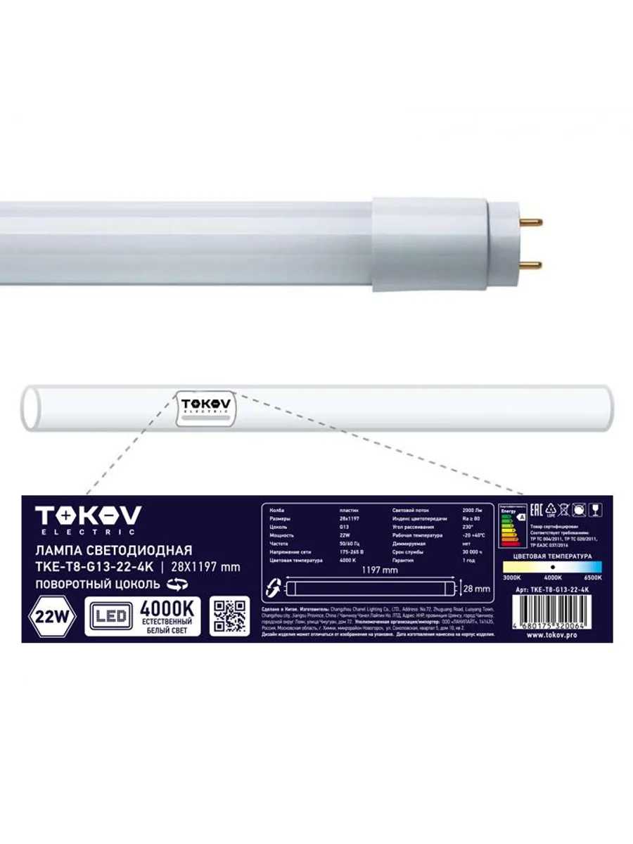 Лампа светодиодная 22Вт линейная T8 4000К G13 176-264В TOKOV ELECTRIC TKE-T8-G13-22-4K - купить в KeepBuilding | KeepBuilding