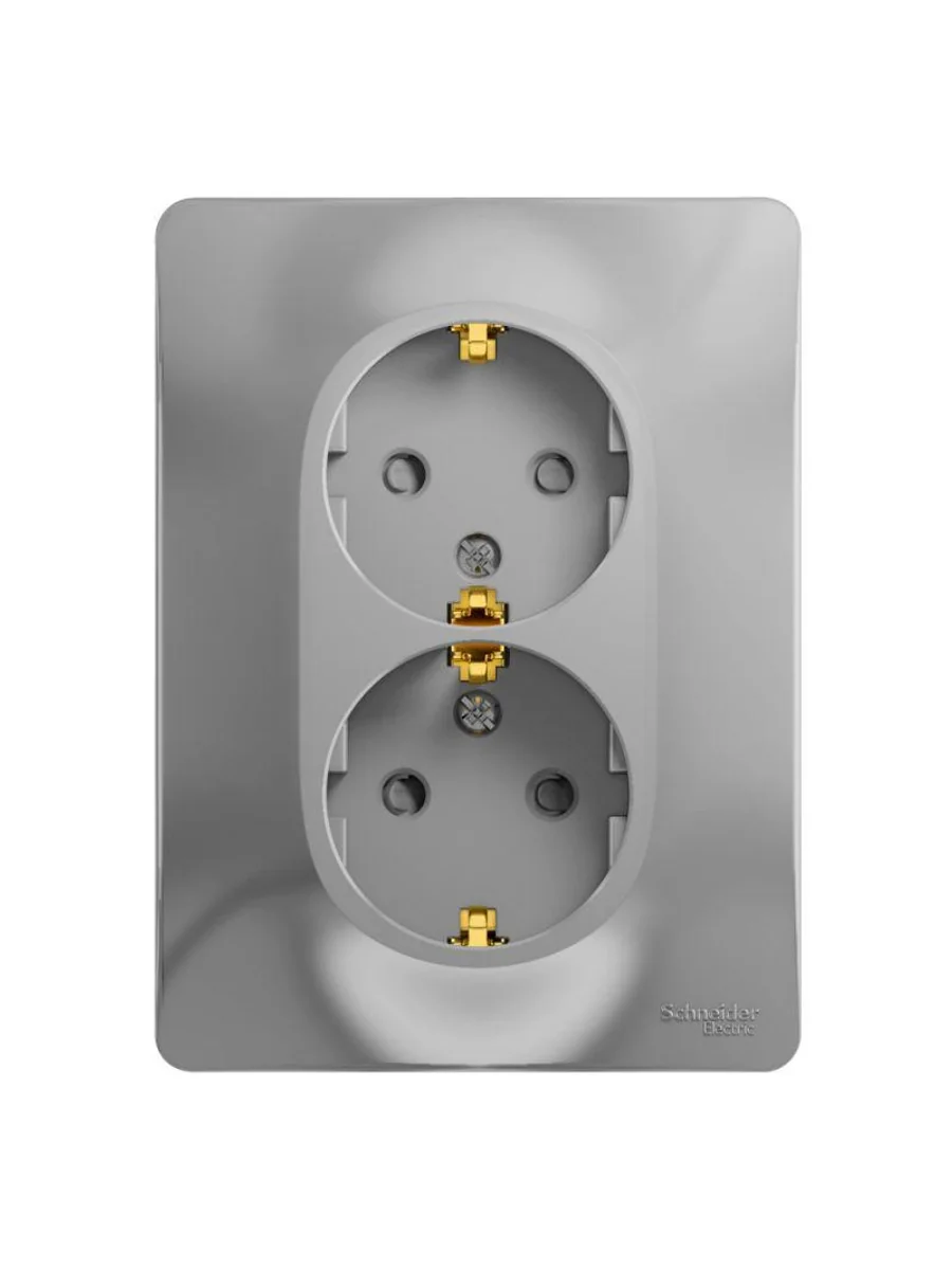 Розетка двойная Systeme Electric серии Glossa (в сборе, цвет алюминий) с заземлением и шторками подходит для сетей 250 В, на ток 16 А. - Заземляющий контакт обеспечивает дополнительную защиту от удара электрическим током. При наличии заземления электрический потенциал уходит в землю, защищая человека. - Выполнен из материала PС+ASA, стойкого к УФ-излучению и появлению царапин. - Двойная розетка позволяет подключить два устройства в одном месте (ранее Schneider Electric NU206730).
