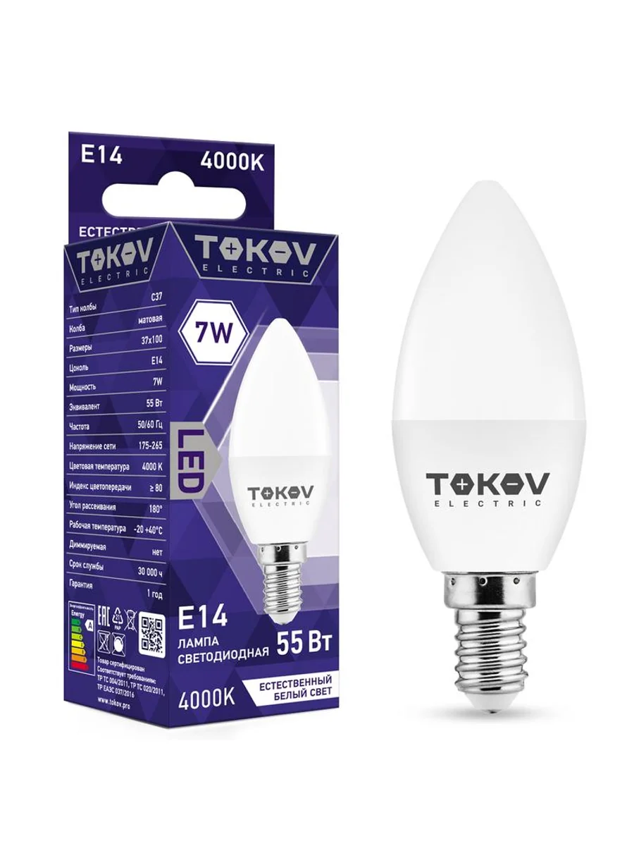 Лампа светодиодная 7Вт С37 4000К Е14 176-264В TOKOV ELECTRIC TKE-C37-E14-7-4K - купить в KeepBuilding | KeepBuilding