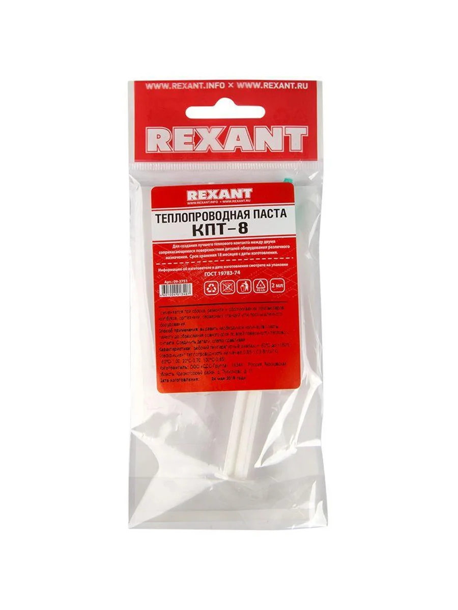 Паста теплопроводная КПТ-8 2 мл (шприц) REXANT предназначена для создания лучшего теплового контакта между двумя соприкасающимися поверхностями деталей оборудования различного назначения, путем заполнения зазора между ними. Применяется при сборке, ремонте и обслуживании компьютеров, ноутбуков, оргтехники, серверных станций или промышленного оборудования. Способ применения: выдавить необходимое количество пасты; нанести, до образования ровного слоя, по всей поверхности теплового контакта; соединить детали, слегка сдавливая. Характеристики: Рабочий температурный диапазон: -60...+180 °C Коэффициент теплопроводности не менее 0,65-1,00 Вт/(м*К)" Объем: 2 мл Меры предосторожности: хранить в местах, недоступных для детей.