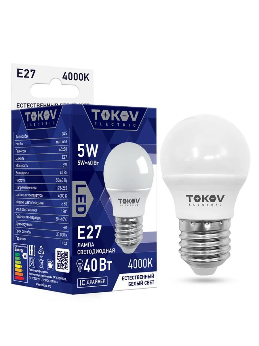 Лампа светодиодная 5Вт G45 4000К Е27 176-264В TOKOV ELECTRIC TKE-G45-E27-5-4K - купить в KeepBuilding | KeepBuilding