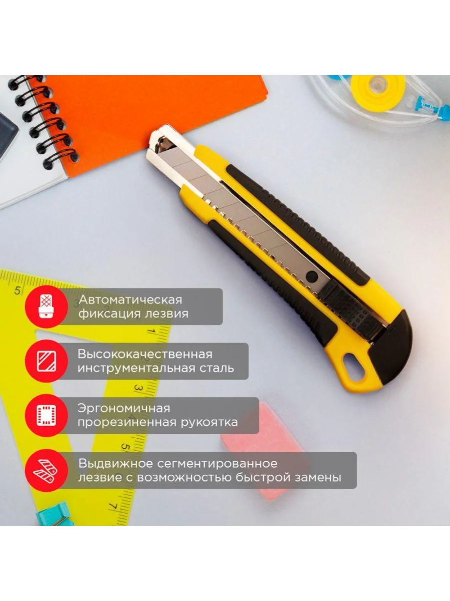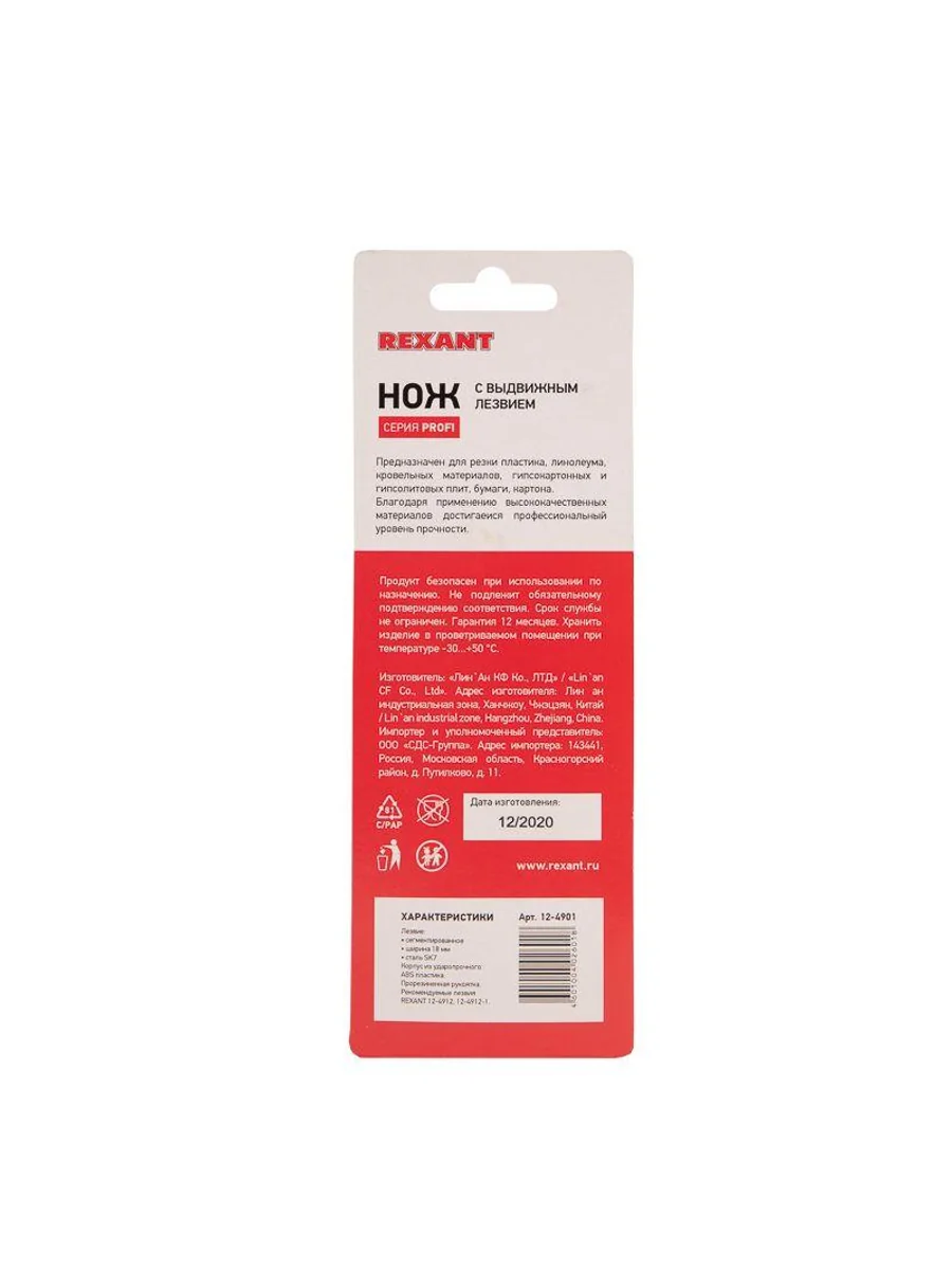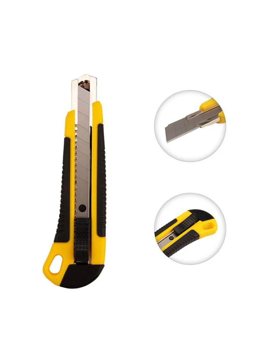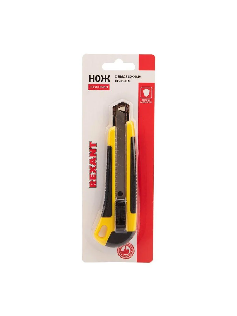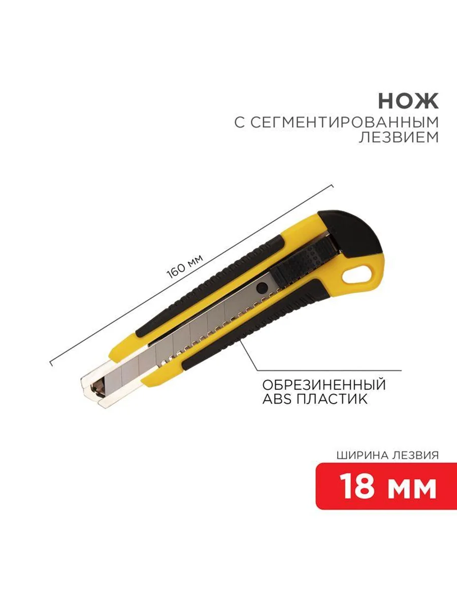 Нож REXANT с выдвижным лезвием отличный помощник для разрезания различных материалов: пластика, линолеума, кровельных материалов, гипсокартонных и гипсолитовых плит, бумаги, картона и т.д. Корпус ножа выполнен из ABS пластика, что позволяет прикладывать меньше усилий при резке и обеспечивает долгий срок службы. Лезвие шириной 18 мм изготовлено из высококачественной инструментальной стали, фиксируется автоматически. Когда крайний сегмент затупляется, его можно отломить и продолжить использовать инструмент. Замена лезвия осуществляется вручную.