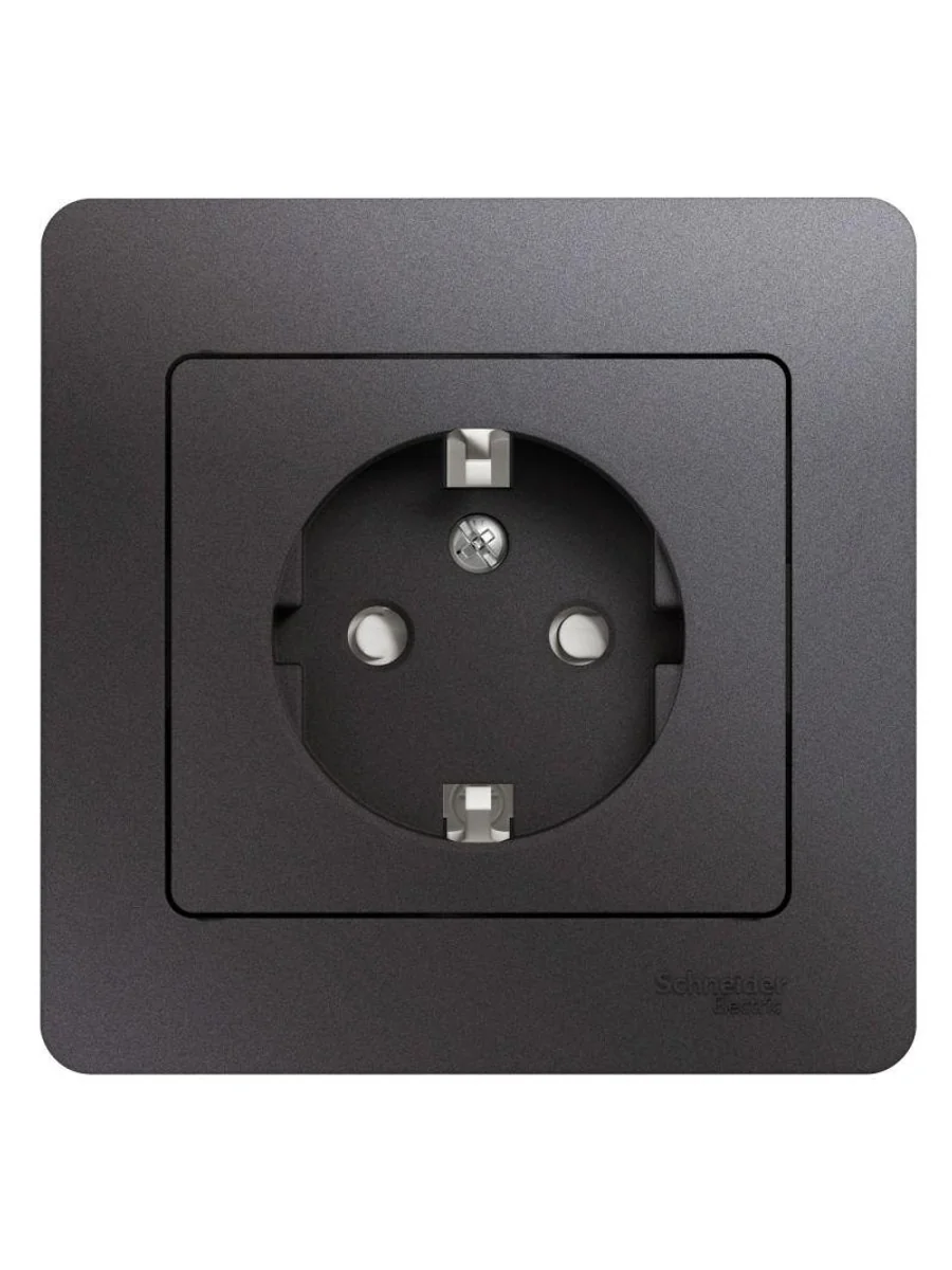 Розетка Systeme Electric (ранее Schneider Electric) серии Glossa (в сборе, цвет графит) одинарная с заземлением и без шторок подходит для сетей 250 В, на ток 16 А. - Заземляющий контакт обеспечивает дополнительную защиту от удара электрическим током. При наличии заземления электрический потенциал уходит в землю, защищая человека. - Выполнен из материала PС+ASA, стойкого к УФ-излучению и появлению царапин. - Эргономичные клеммы розеток расположены в один ряд.