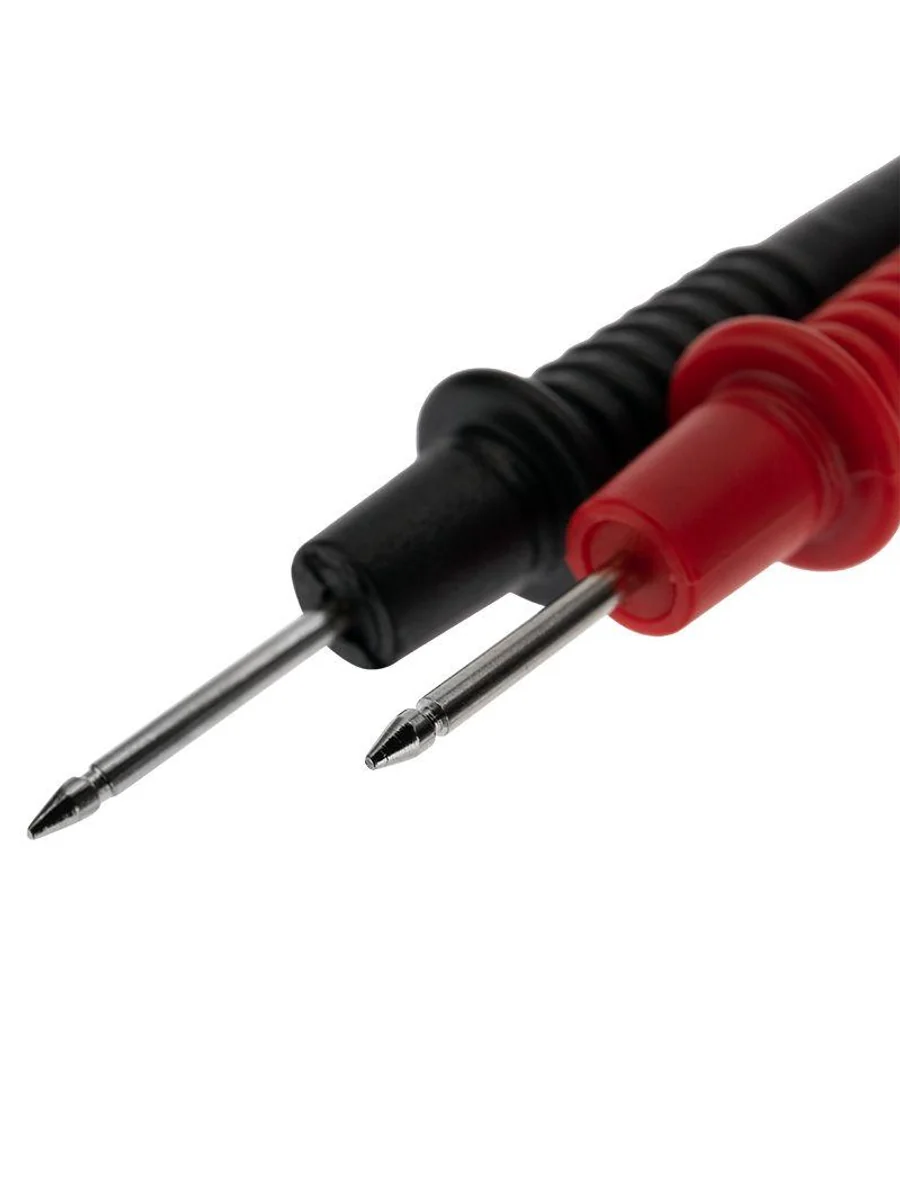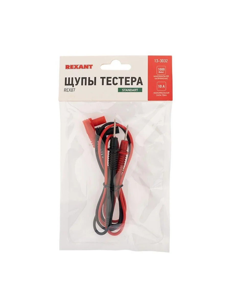 Щупы REX07 REXANT для тестера и токовых клещей. Они подсоединяются к гнездам мультиметра, для удобства имеют разные цвета: черный и красный. Как правило, черный щуп подключается на общее гнездо, а красный — на гнездо «+». Клеммы, провода и ручки щупов надежно изолированы для защиты пользователя от поражения электрическим током. Для удобства работы металлические концы щупов заострены. Класс защиты от перенапряжения: Категория 2 до 1000 В 10 А Длина: 850 мм Длина рукояти от защитной гарды: 82 мм Длина жала: 17 мм Длина штекера: 13 мм Диаметр штекера: 8 мм Угол штекера: 90 градусов (прямой) Подходят для недорогих приборов с коротким посадочным гнездом, серий MASTECH, PROconnect, 830, 832, 838 и т. п.