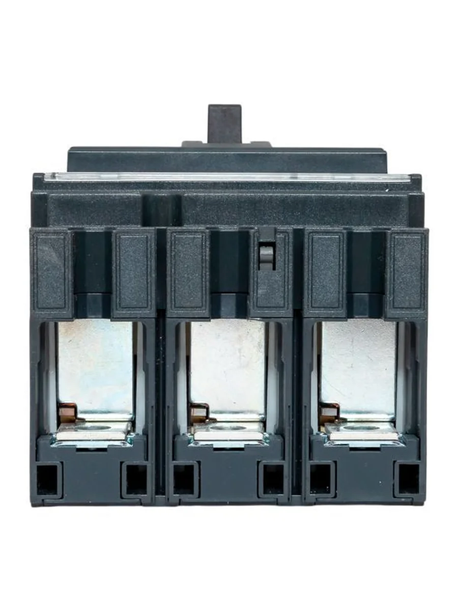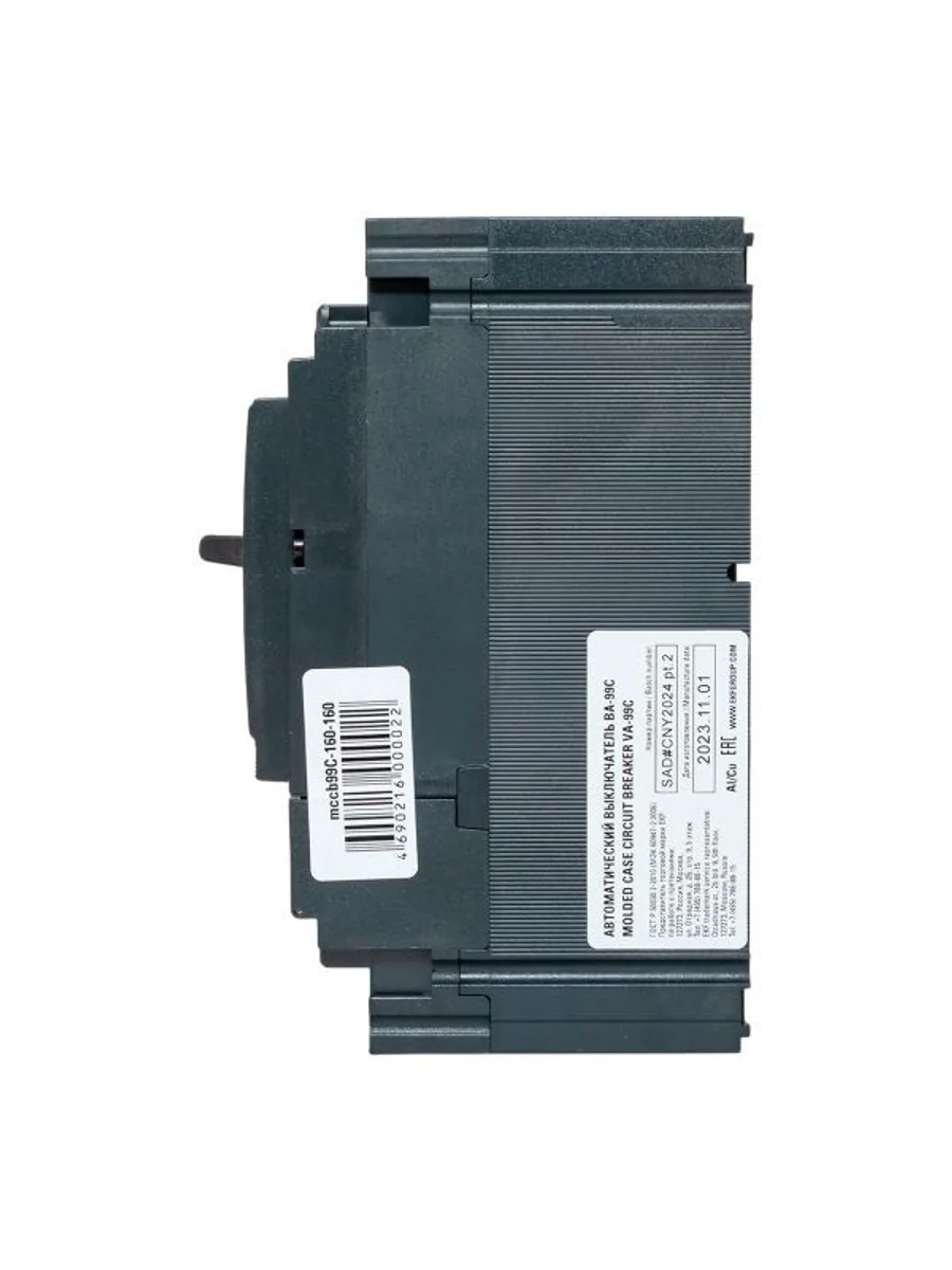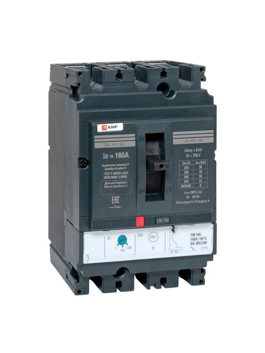 Выключатель ВА-99С выполнен в виде моноблока и состоит из основания и крышки с фальш-панелью, в которой имеется окно для рукоятки управления и толкатель кнопки «Тест» – для проверки механизма отключения выключателя.Основание выполнено из термостойкой пластмассы, не поддерживающей горение и являющейся несущей конструкцией для присоединительных зажимов, блок ротоактивных контактов с двумя дугогасительными камерами представляет собой жесткую сборку в отдельном корпусе, механизма управления, блока защиты от сверхтоков и перегрузки (расцепителя). Крышка закрывает все подвижные элементы механизма управления и внутренние токоведущие части.