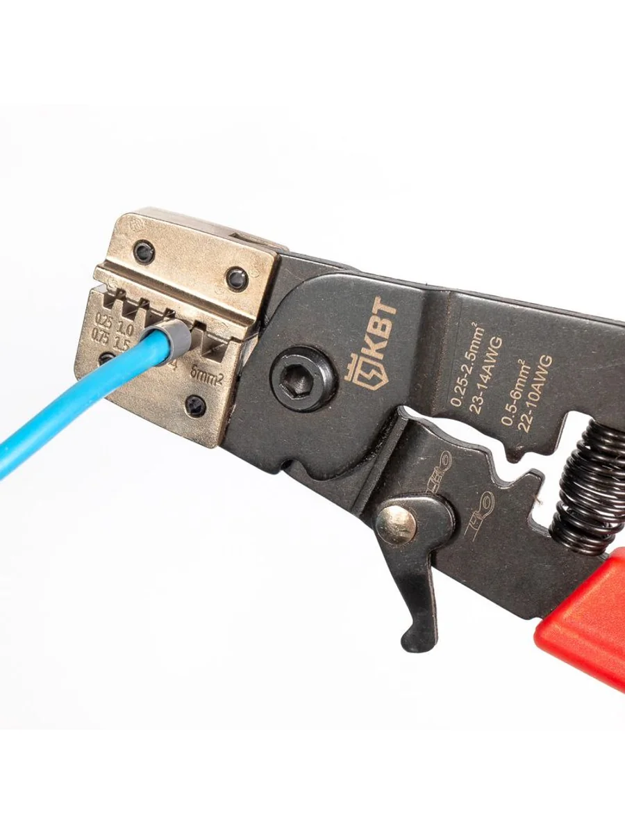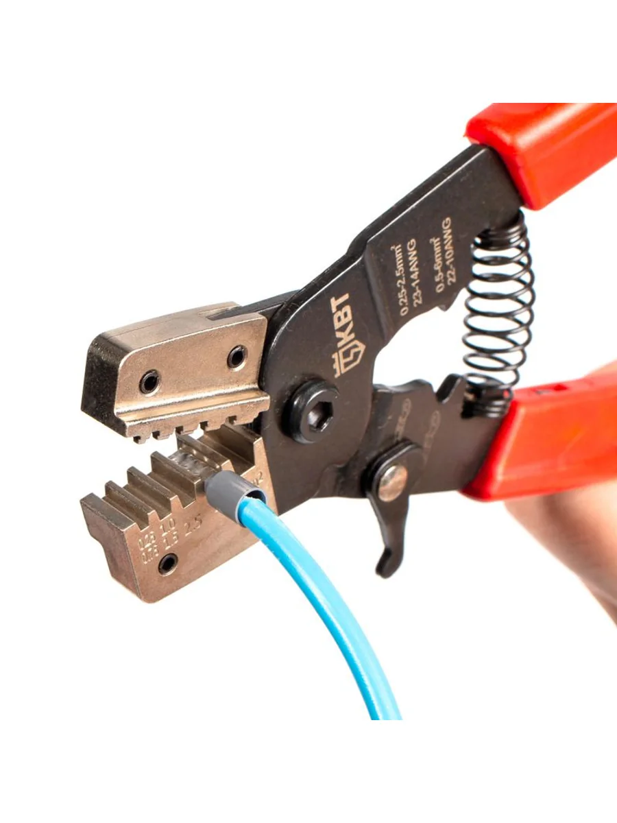 • Диапазон сечений втулочных наконечников: • НШВИ, НШВ: 0.25–6.0 мм2 • Трапециевидный профиль обжима с вдавливанием • Ширина опрессовочного профиля: 10 мм • Инструмент перекрывает диапазон из 7 размеров втулочных наконечников • Возможность опрессовки изолированных и неизолированных наконечников малых сечений • Компактная и легкая модель • Возвратная пружина и блокиратор рукояток • Обработка поверхности: никелирование/воронение • Эргономичные рукоятки • Вес: 180 г • Длина: 182 мм