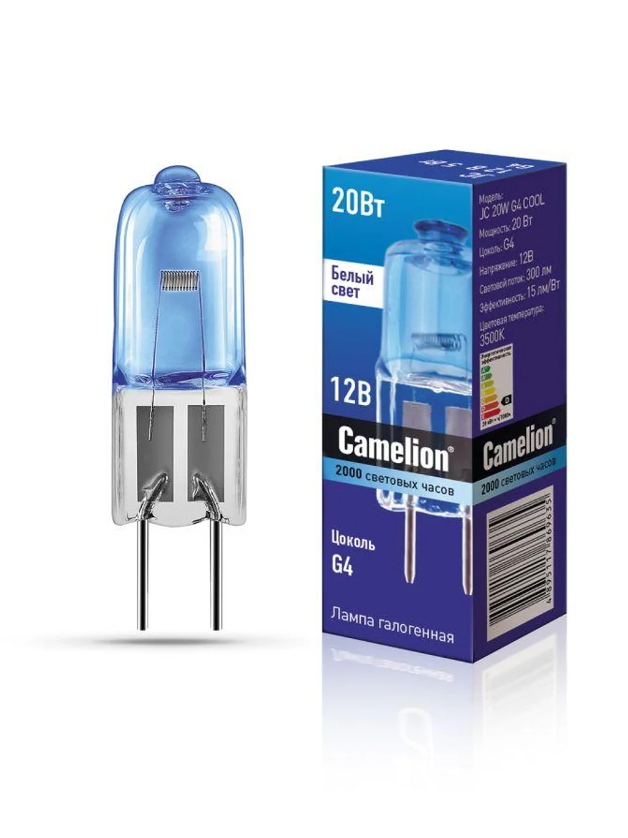 Галогенные лампы предназначены для светильников внутреннего и наружного освещения, прожекторов. Лампы имеют повышенный срок службы - работают вдвое дольше обычных ламп накаливания. Могут использоваться с регуляторами яркости. Галогенная лампа, мощность, Вт - 20, напряжение, В - 12, световой поток, лм - 300, форма колбы - капсула, цвет колбы - синяя, цоколь G4, цветовая температура, К - 3000, срок службы, ч. - 2000
