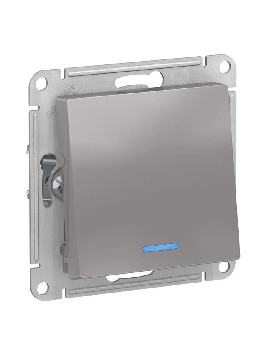 Механизм переключателя 1-клавишного с подсветкой Systeme Electric (ранее Schneider Electric) серии AtlasDesign в цвете алюминий подходит для сетей 250 В, на ток 10 А. Благодаря светодиодной подсветке синего цвета изделие легко найти в темноте. Переключатель позволяют управлять одним источником света с двух точек. Лицевые детали из качественного ABS-пластика, устойчивого к царапинам и УФ-излучению.