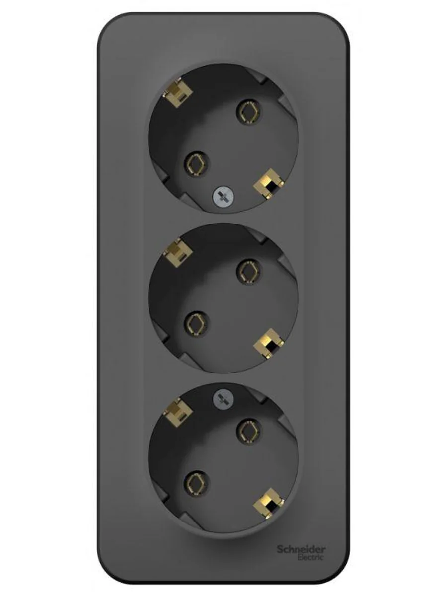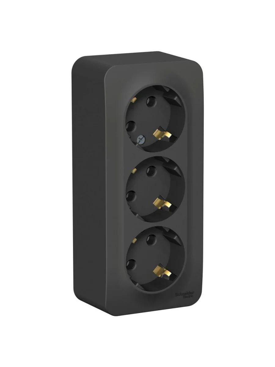 Розетка Systeme Electric (ранее Schneider Electric) BLANCA (антрацит, открытой установки) трехместная, без шторок, с заземлением и изолирующей пластиной предназначена для сетей до 250В, на ток до 16А. Трехместная розетка позволяет подключить три устройства в одном месте. Заземление обеспечивает безопасность при косвенном прикосновении. Она изготовлена из ABS-пластика, проста в установке и удобна в применении.