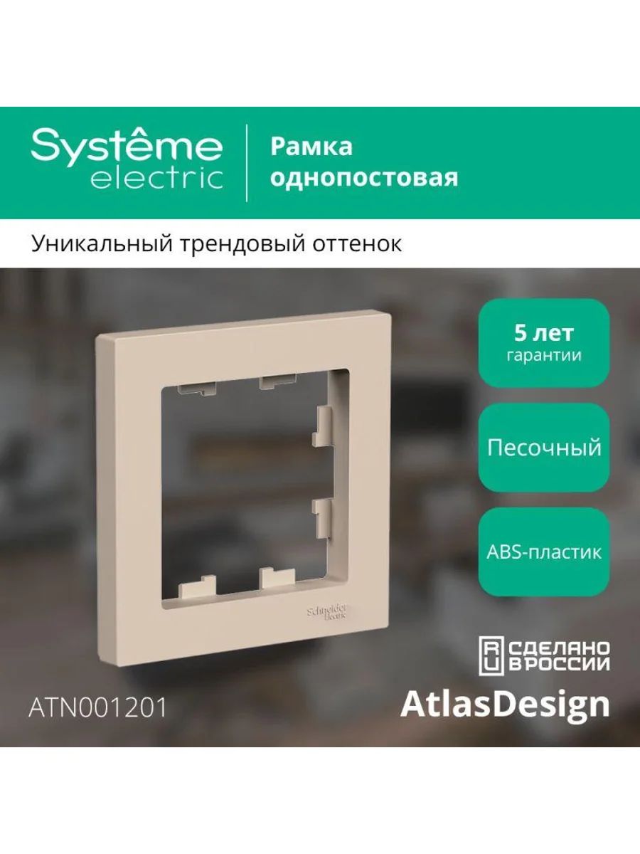 Рамка Systeme Electric (ранее Schneider Electric) серии AtlasDesign в цвете ПЕСОЧНЫЙ одинарная. - Лицевые детали из качественного ABS-пластика, устойчивого к царапинам и УФ-излучению. - Позволяет гармонично вписать электроустановочное изделие в интерьер помещения.