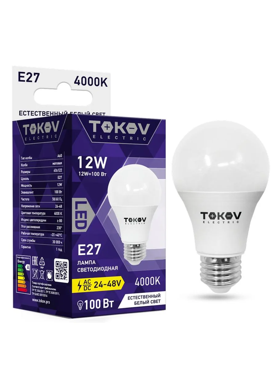 Лампа светодиодная низковольтная 12Вт А60 4000К Е27 24/48В TOKOV ELECTRIC TKE-A60-E27-12-4K-24/48 - купить в KeepBuilding | KeepBuilding