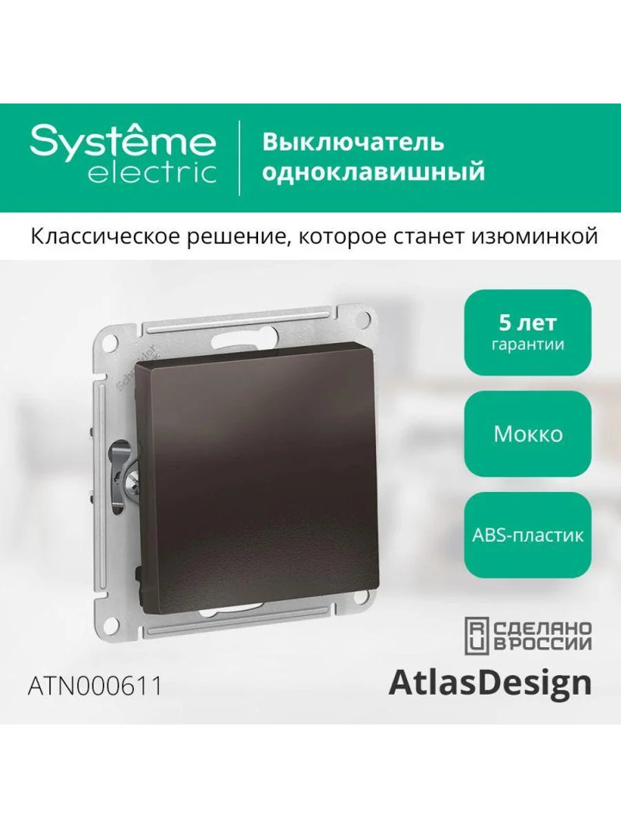 Механизм Systeme Electric (ранее Schneider Electric) серии AtlasDesign в цвете мокко выключателя 1-клавишного подходит для сетей 250 В, на ток 10 А. Лицевые детали из качественного ABS-пластика, устойчивого к царапинам и УФ-излучению. Усиленные прямые монтажные лапки для лучшей фиксации механизма в монтажной коробке.