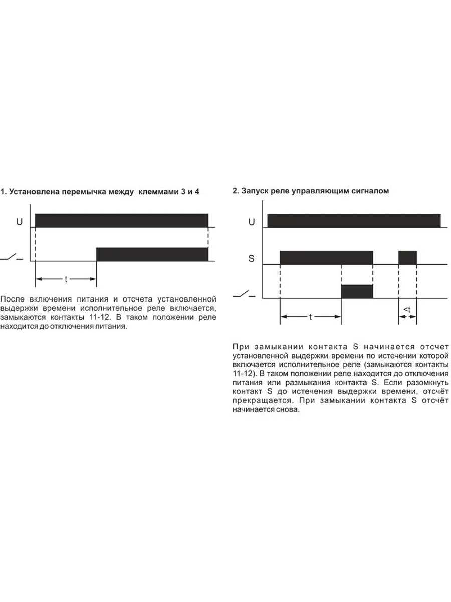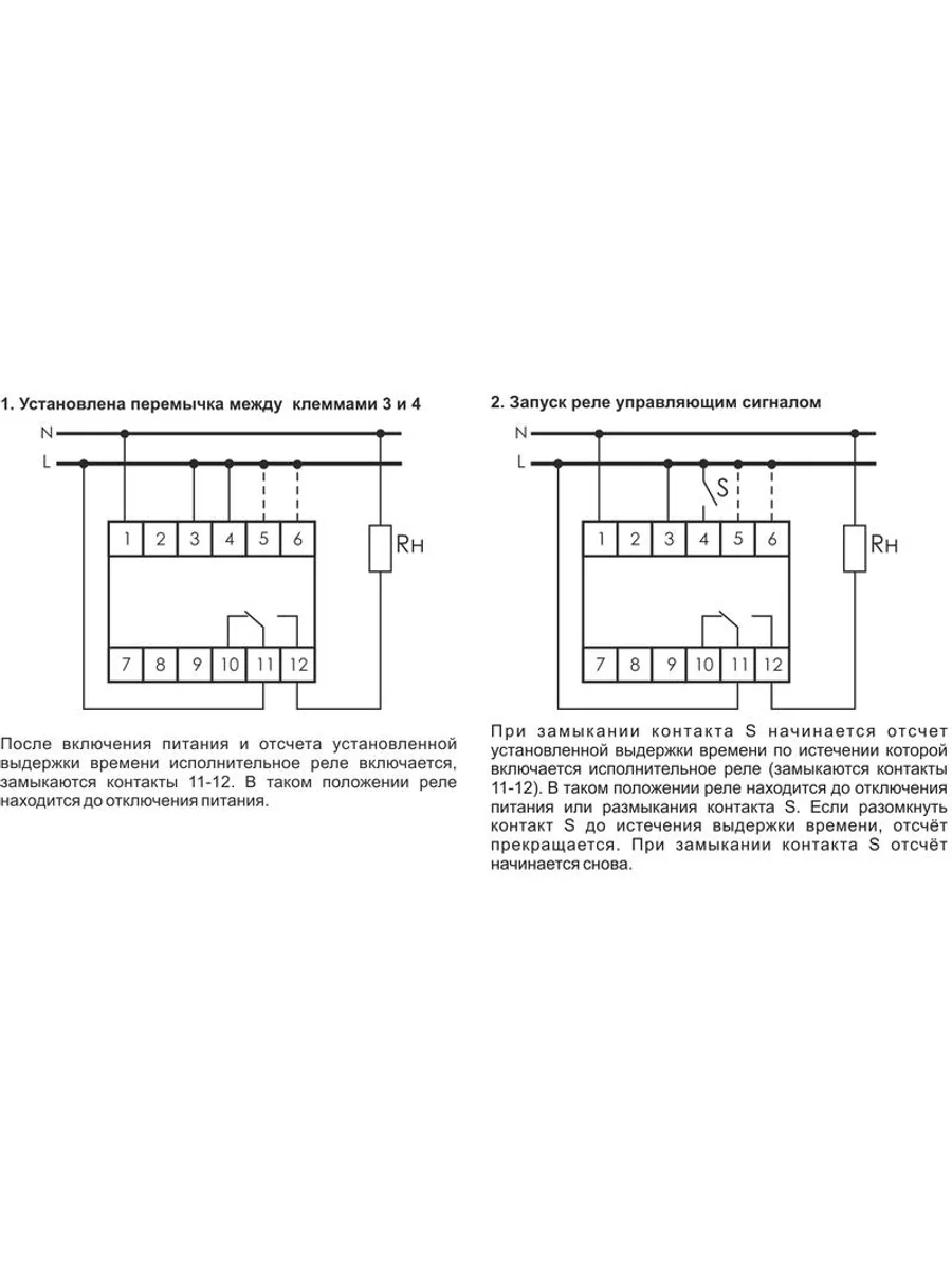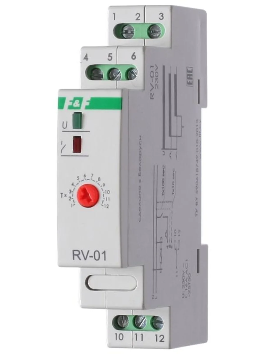 Реле времени серии "RV" Монтаж на DIN-рейку. Предназначено для включения потребителей в системах автоматики (в вентиляционных, отопительных, осветительных, сигнализационных и т.п.) через заданный отрезок времени. Принцип работы 1. Запуск реле подачей напряжения питания После включения питания и отсчета установленной выдержки времени исполнительное реле включается, замыкаются контакты 11-12. В таком положении реле находится до отключения питания. 2. Запуск реле управляющим сигналом При замыкании контакта S начинается отсчет установленной выдержки времени по истечении которой включается исполнительное реле (замыкаются контакты 11-12). В таком положении реле находится до отключения питания или размыкания контакта S. Если разомкнуть контакт S до истечения выдержки времени, отсчёт прекращается. При замыкании контакта S отсчёт начинается снова. Особенности: 2 режима работы; вход управления; напряжение питания 230 В AC; диапазон выдержки времени 0,1...1200 с ; контакт - 1NO/NC (16 А).
