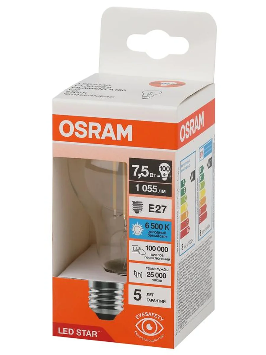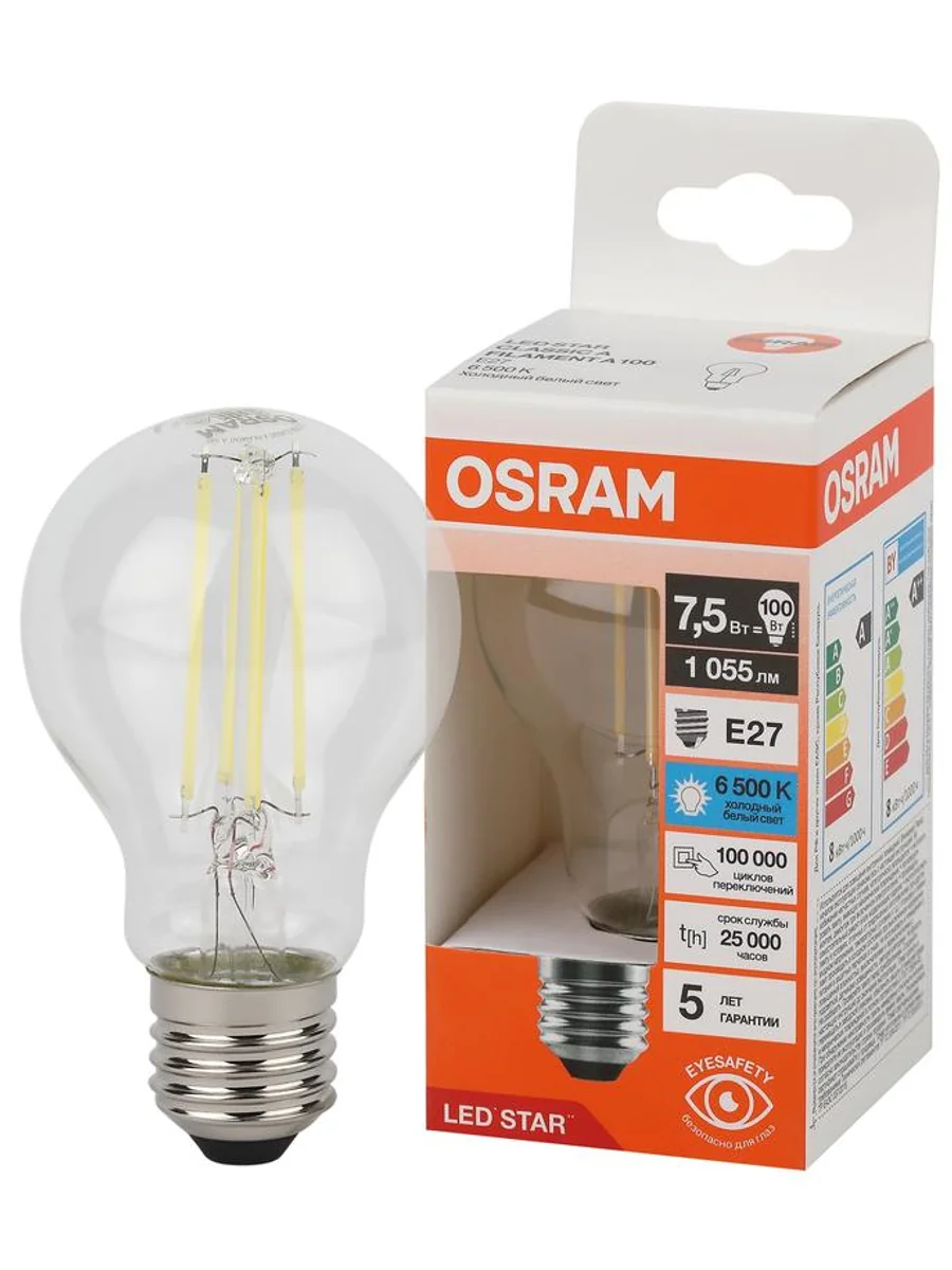 Светодиодные лампы OSRAM - разумная замена традиционным лампам накаливания или галогенным лампам. Светодиодные лампы OSRAM снижают затраты на освещение до 90% при сохранении привычного уровня освещенности. Эта лампа OSRAM серии LED Star выполнена в форме колбы A ("груша") с цоколем E27. Материал колбы - стекло, исполнение - прозрачное. Световой поток 1055 люмен, что соответствует лампе накаливания на 100 Вт. Это филаментная лампа прекрасно выглядит, а потому идеально подходит для открытых светильников и декоративного освещения. Эта лампа излучает холодный белый свет, угол пучка - широкий. Качество света на высоте: низкие пульсации защищают глаза, а высокий индекс цветопередачи позволяет видеть мир в его истинном цвете. Кроме того, лампы OSRAM полностью безопасны для здоровья, поскольку в них нет опасных материалов по европейскому стандарту RoHS, а также они не производят вредных электромагнитных излучений, что подтверждено ЭМС (сертификат электромагнитной совместимости). Лампа проработает долго: срок службы - 25000 часов, 5 года гарантии. Светодиодные лампы OSRAM - умный выбор для здоровья семьи и кошелька!