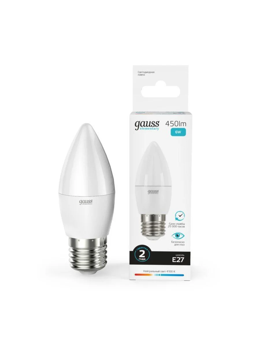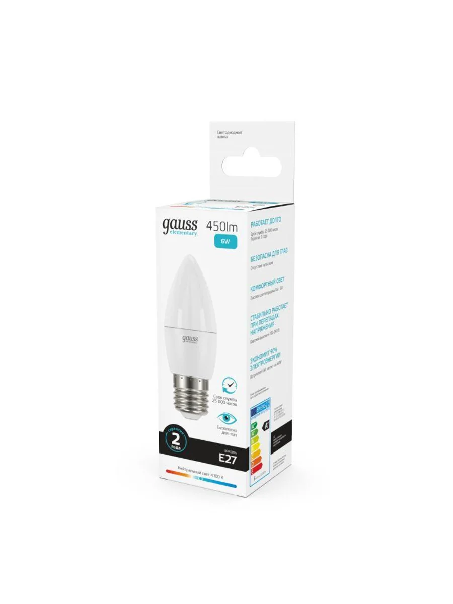 Лампа светодиодная Elementary 6Вт свеча 4100К нейтр. бел. E27 450лм GAUSS 33226 - купить в KeepBuilding | KeepBuilding