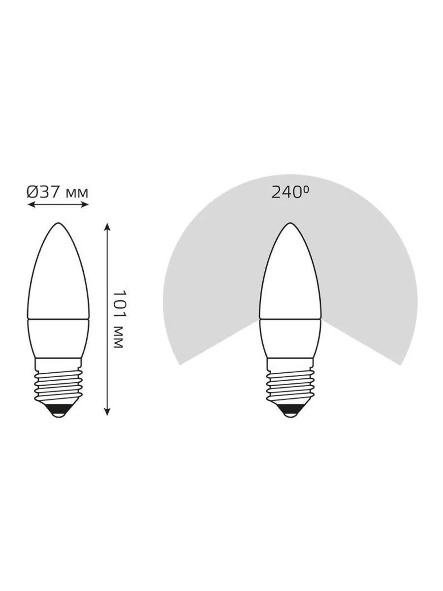 Лампа светодиодная LED Elementary Candle 6Вт E27 4100К Gauss 33226 – лампа с колбой вида "свеча", белого света, длиной 112 мм, диаметром 37 мм, с цоколем Е27, мощностью 6 Вт. Цветовая температура 4100 К.