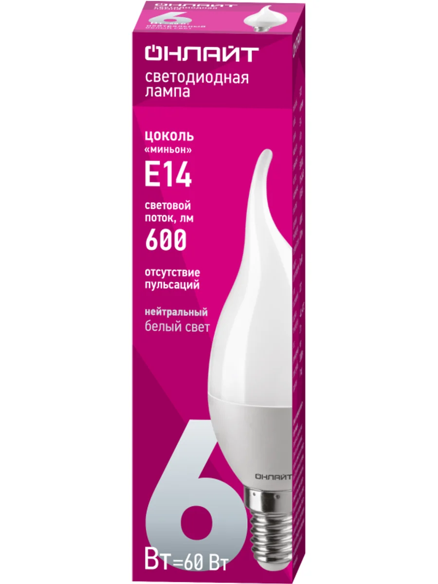 Лампа светодиодная 71 621 OLL-FC37-6-230-4K-E14-FR ОНЛАЙТ 4670004716212 – лампа с колбой вида "свеча", белого света, длиной 130 мм, с цоколем Е14, мощностью 6 Вт. Цветовая температура 4000 К.