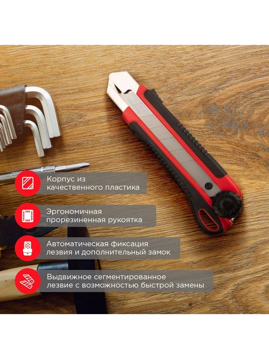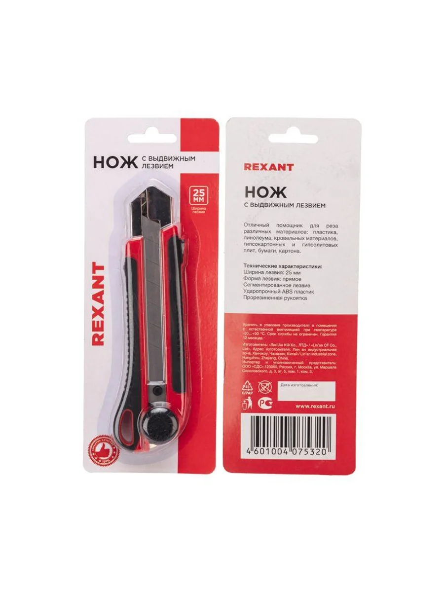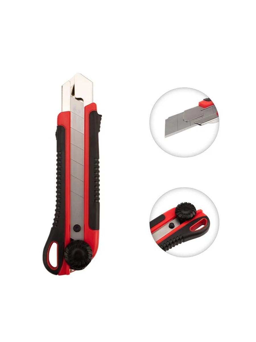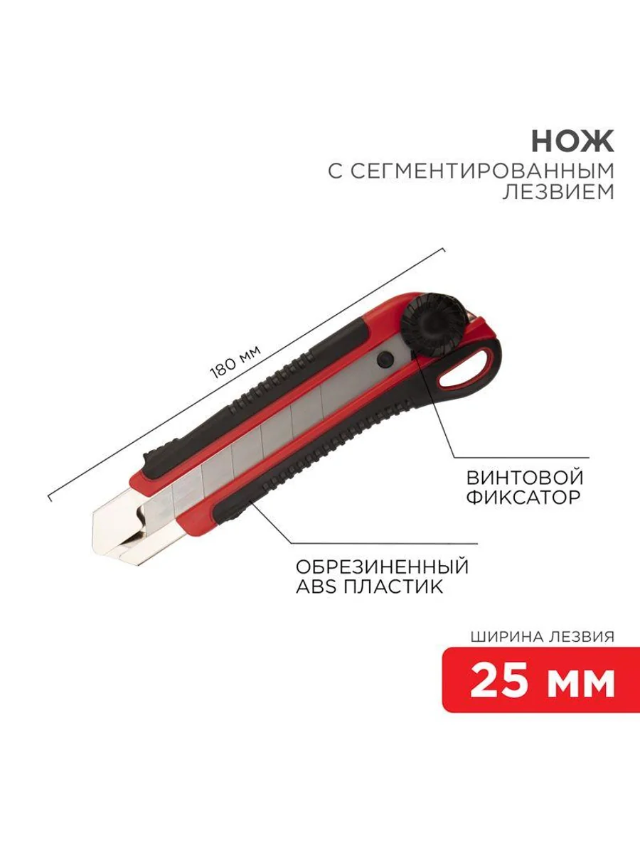 Нож с выдвижным сегментированным лезвием REXANT предназначен для реза различных материалов: пластика, линолеума, кровельных материалов, гипсокартонных и гипсолитовых плит, бумаги, картона. Прочный корпус инструмента из ABS-пластика обладает удобной обрезиненной рукояткой, что увеличивает его эксплуатационные свойства. Стальное лезвие фиксируется автоматически, также предусмотрен дополнительный замок. Когда крайний сегмент затупляется, его можно отломить и продолжить использовать инструмент. Качественные материалы обеспечивают долгий срок службы инструмента. Замена лезвия осуществляется вручную.