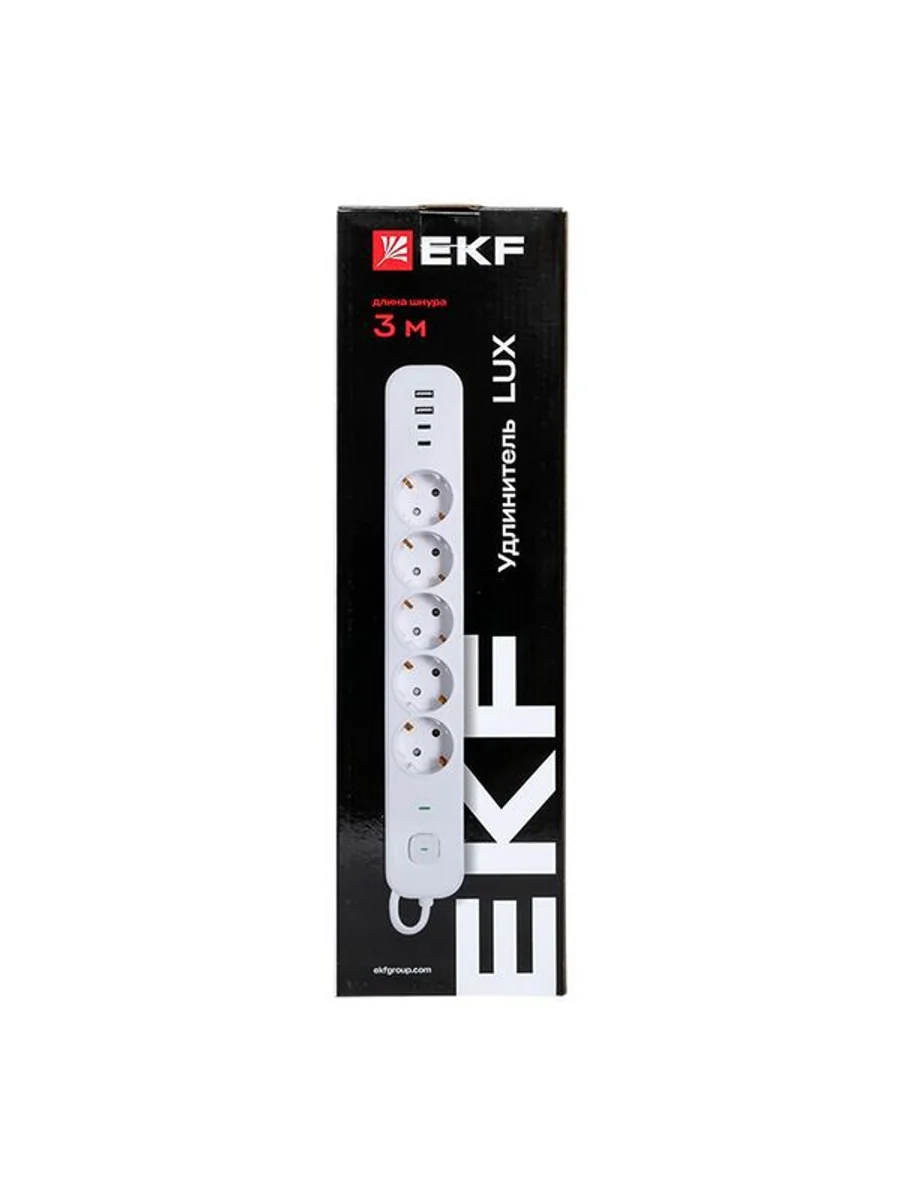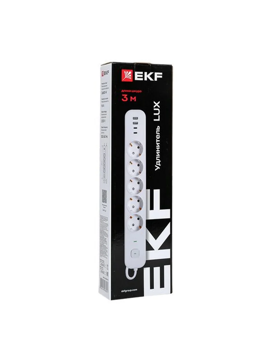 Удлинитель EKF серии LUX предназначен для подключения к электрической сети всех видов бытовой и офисной техники, для зарядки и питания устройств через порты USB.