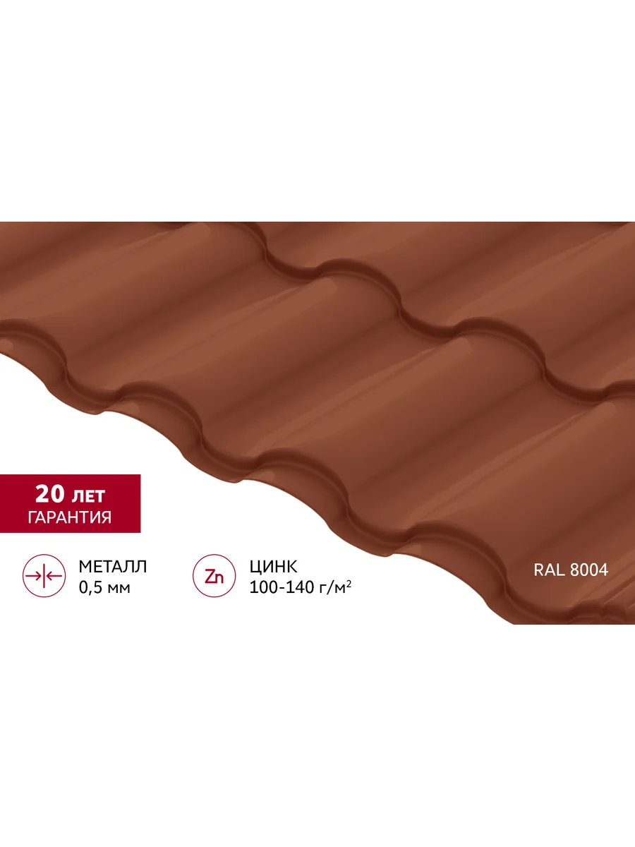 Металлочерепица 'Кредо' ('Kredo') от компании GrandLine представляет собой высококачественное кровельное покрытие, которое сочетает в себе эстетическую привлекательность и практичность. Благодаря своему цвету терракота (RAL 8004) и покрытию Satin, металлочерепица не только прекрасно смотрится на крыше, но и обладает отличной устойчивостью к атмосферным воздействиям. Толщина металла в 0,5 мм обеспечивает дополнительную прочность и долговечность материала.