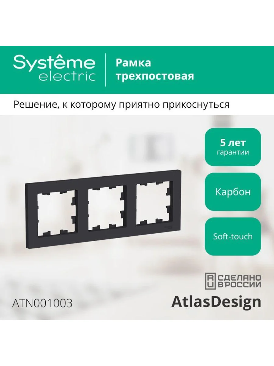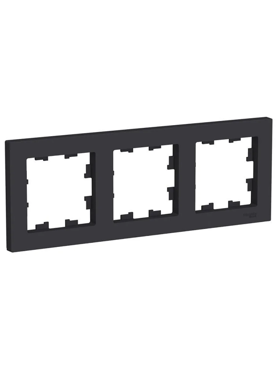 Рамка Systeme Electric (ранее Schneider Electric) серии AtlasDesign в цвете карбон трёхместная. Устанавливается в вертикальном и горизонтальном положениях. Лицевые детали из качественного ABS-пластика, устойчивого к царапинам и УФ-излучению. Позволяет гармонично вписать электроустановочное изделие в интерьер помещения. Благодаря покрытию «soft touch» к изделию приятно прикасаться.