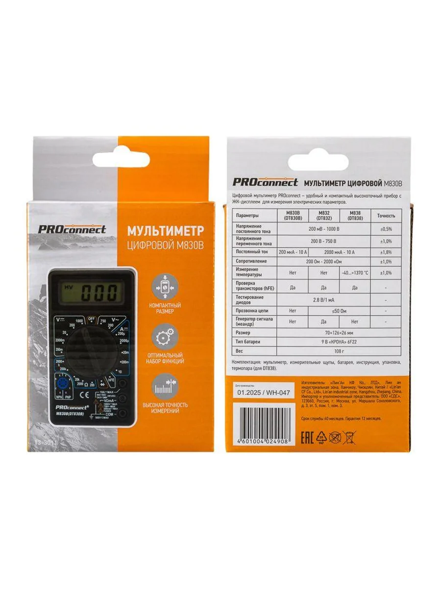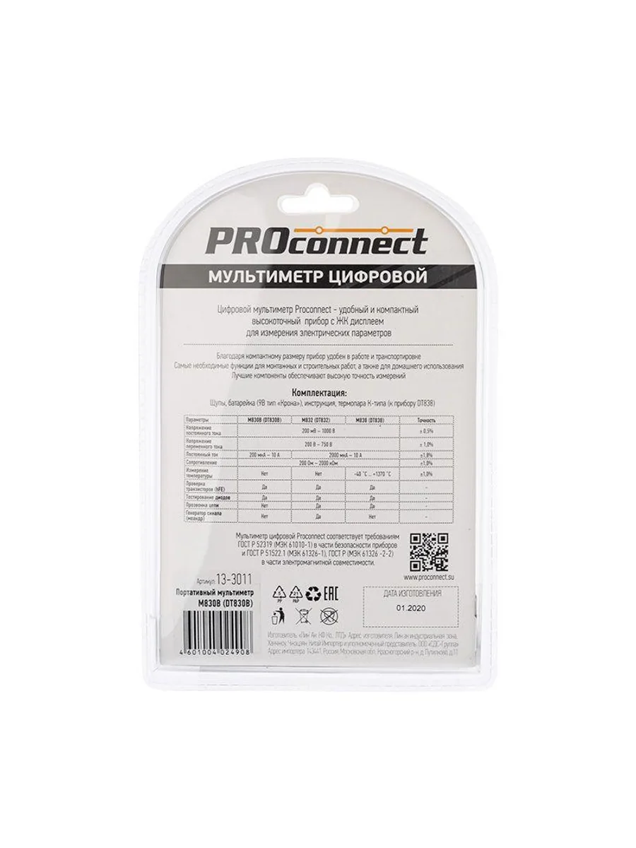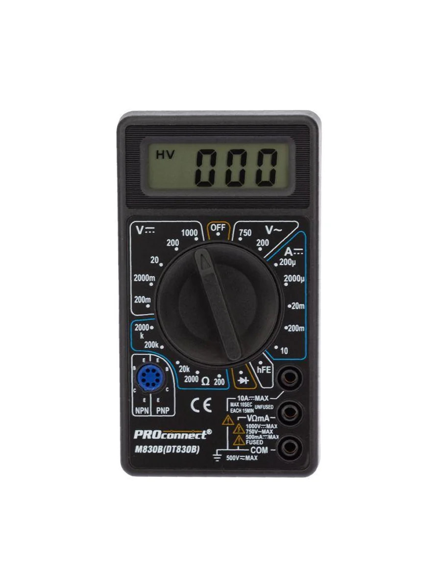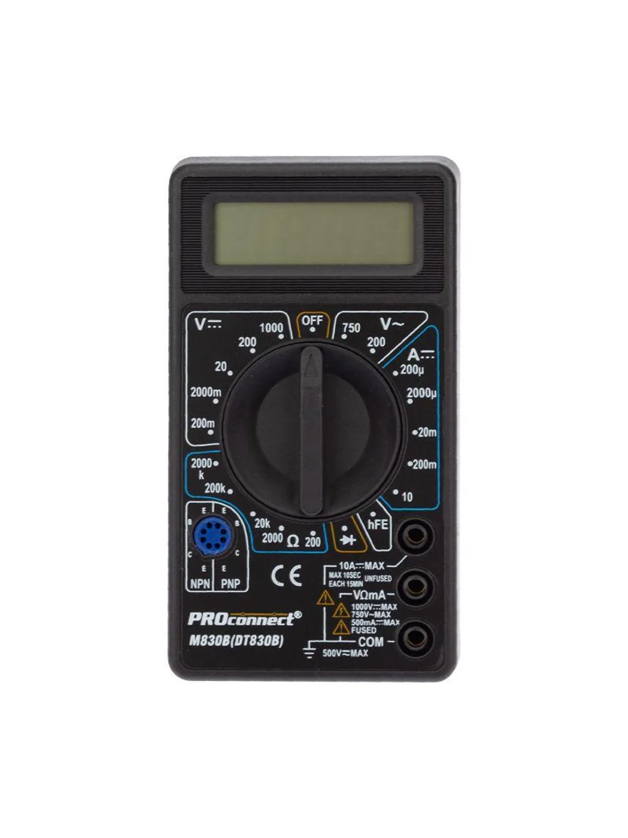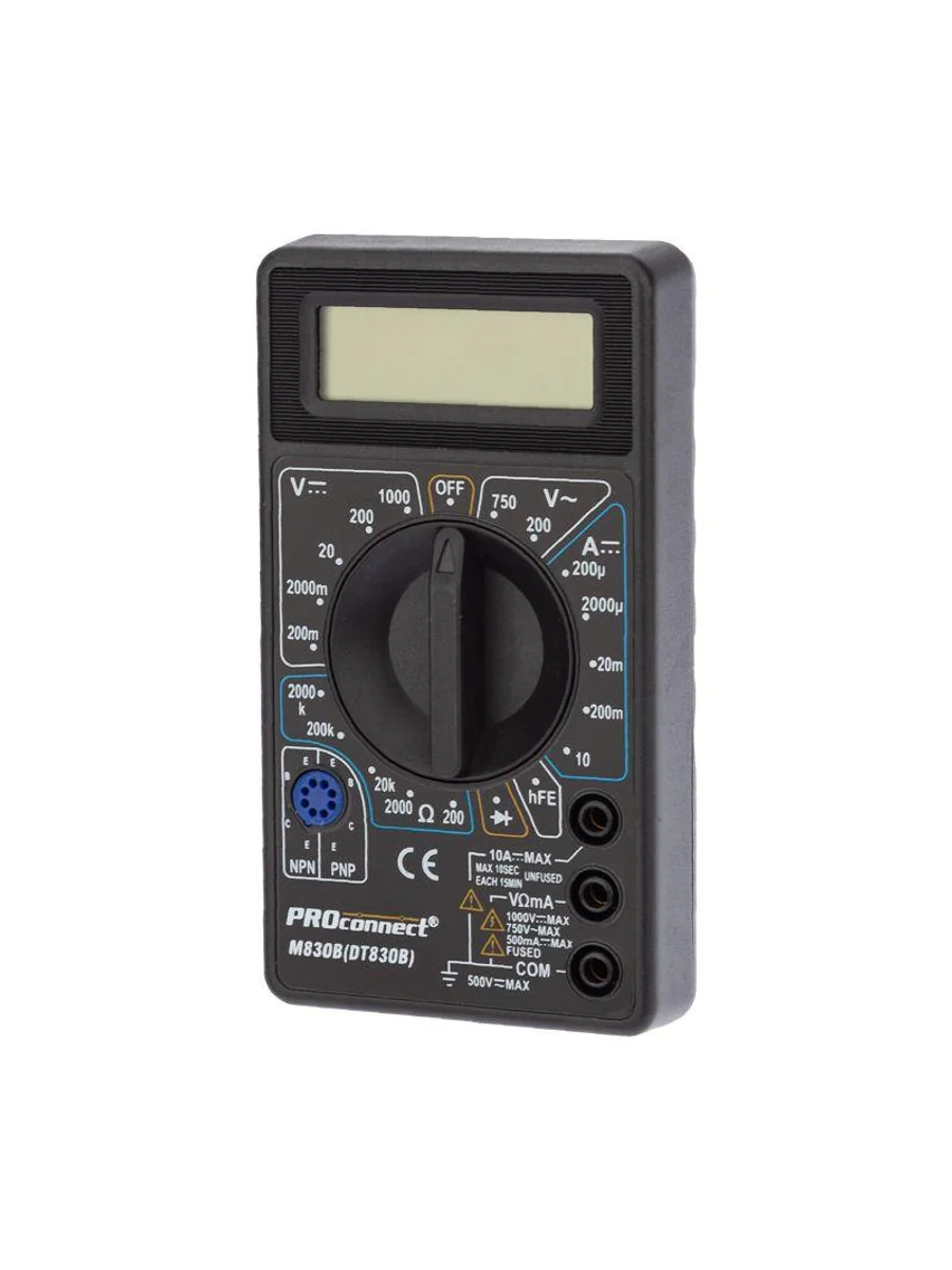 Мультиметр — электроизмерительный прибор, который включает в себя несколько функций и набор измеряемых параметров. Все приборы серии M830 измеряют постоянное и переменное напряжение, постоянный ток и сопротивление в цепи. А также с помощью данного прибора можно проводить тестирование диодов. Прибор M830B является портативным мультиметром, компактные размеры позволяют всегда носить его с собой. Но, несмотря на малые размеры, данный мультиметр обладает широким функционалом и это выгодно отличает его от других. Инженеры старались сделать прибор максимально удобным для использования. Выбор измеряемых величин и пределов измерений производится с помощью усиленного поворотного регулятора, благодаря которому исключается возможность случайного нажатия. Прибор изготовлен из высококачественных материалов, калибровка и тестирование приборов произведены под контролем компании СДС. Характеристики: Постоянное напряжение: 200 mВ (±0.5%+3), 2000 мВ/20 В/200 В (±0,8%+5), 1000 В (±1,0%+5) Переменное напряжение: 200 В/750 В (±2,0%+10) Постоянный ток: 200 мкА/2000 мкА/20 мА (±1.8%+2), 200 мА (±2,0%+2), 10 A (±2.0%+10) Сопротивление: 200 Ом (±1,0%+10), 200 Ом/20 КОм/200 КОм/2000 КОм (±1,0%+4) Тестирование диодов/транзисторов (hfe) 3,5-разрядный дисплей Размер: 70х126х26 мм Тип батареи: Proconnect 9 В «Крона» (в комплекте) Вес: 108 г Комплектация: мультиметр, измерительные щупы, батарея, инструкция, упаковка.