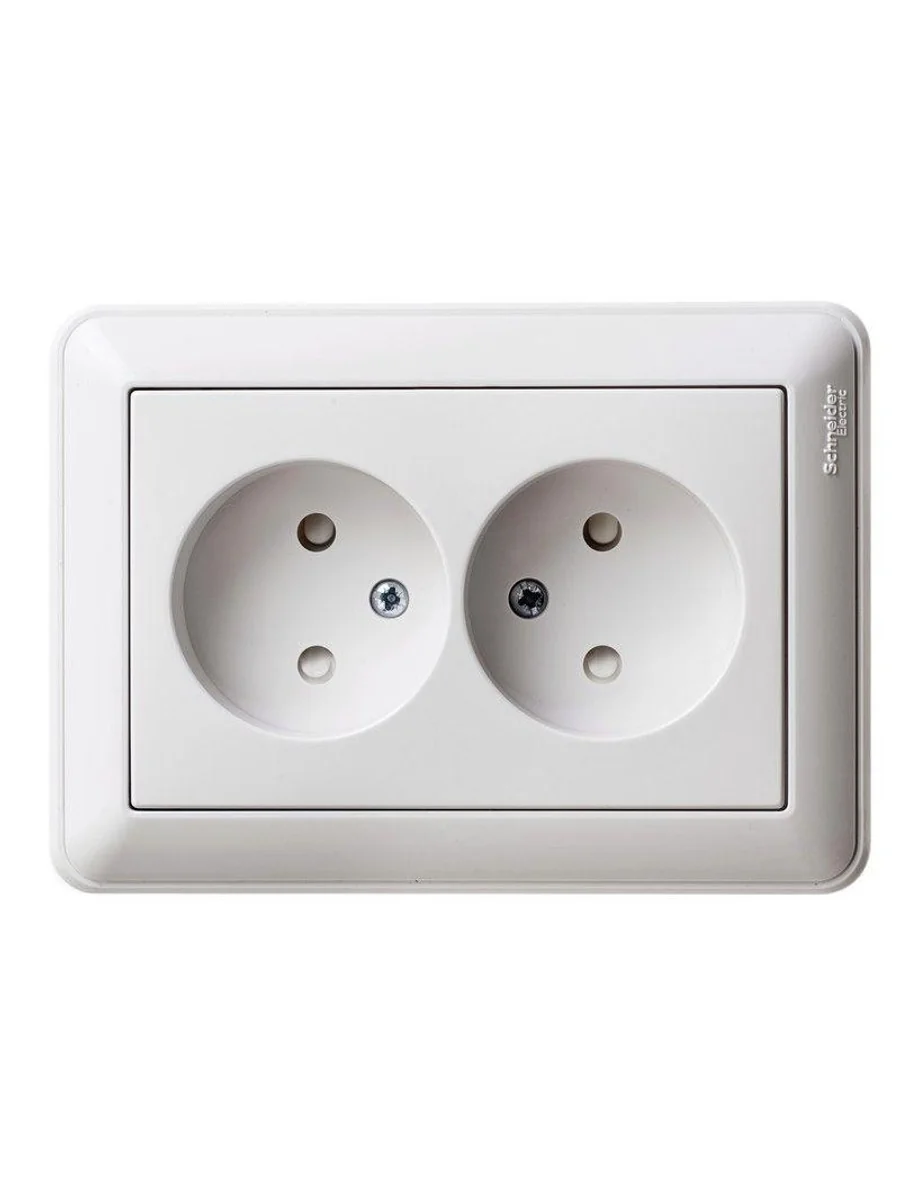 Розетка Systeme Electric (ранее Schneider Electric) W59 (в сборе, цвет белый) двойная без заземления со шторками подходит для сетей 250 В, на ток 16 А. - Контакты розеток выполнены из латуни с высоким содержанием меди. - Шторки обеспечивают дополнительную безопасность в доме, где находятся дети. - Корпус изделия выполнен из высококачественного ABS-пластика.
