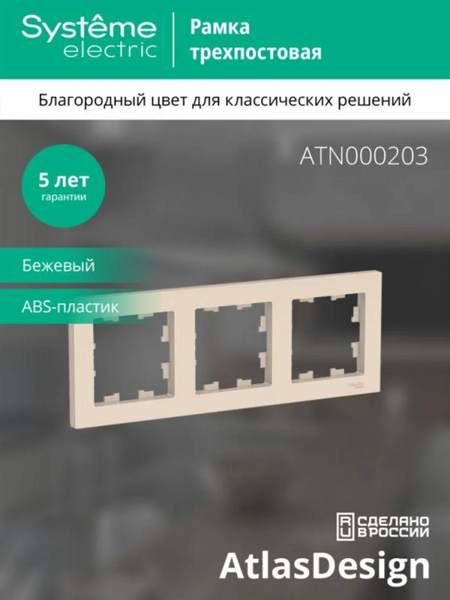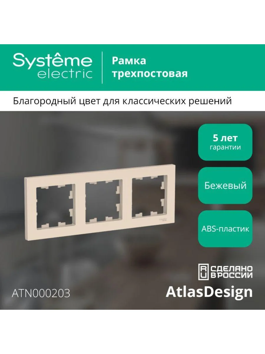 Рамка Systeme Electric серии AtlasDesign в бежевом цвете трёхместная. - Пластик с ионами серебра в белом цвете обеспечивает антибактериальный эффект. - Устанавливается в вертикальном и горизонтальном положениях. - Лицевые детали из качественного ABS-пластика, устойчивого к царапинам и УФ-излучению. - Позволяет гармонично вписать электроустановочное изделие в интерьер помещения (ранее Schneider Electric MGU2.006.25, NU200644).