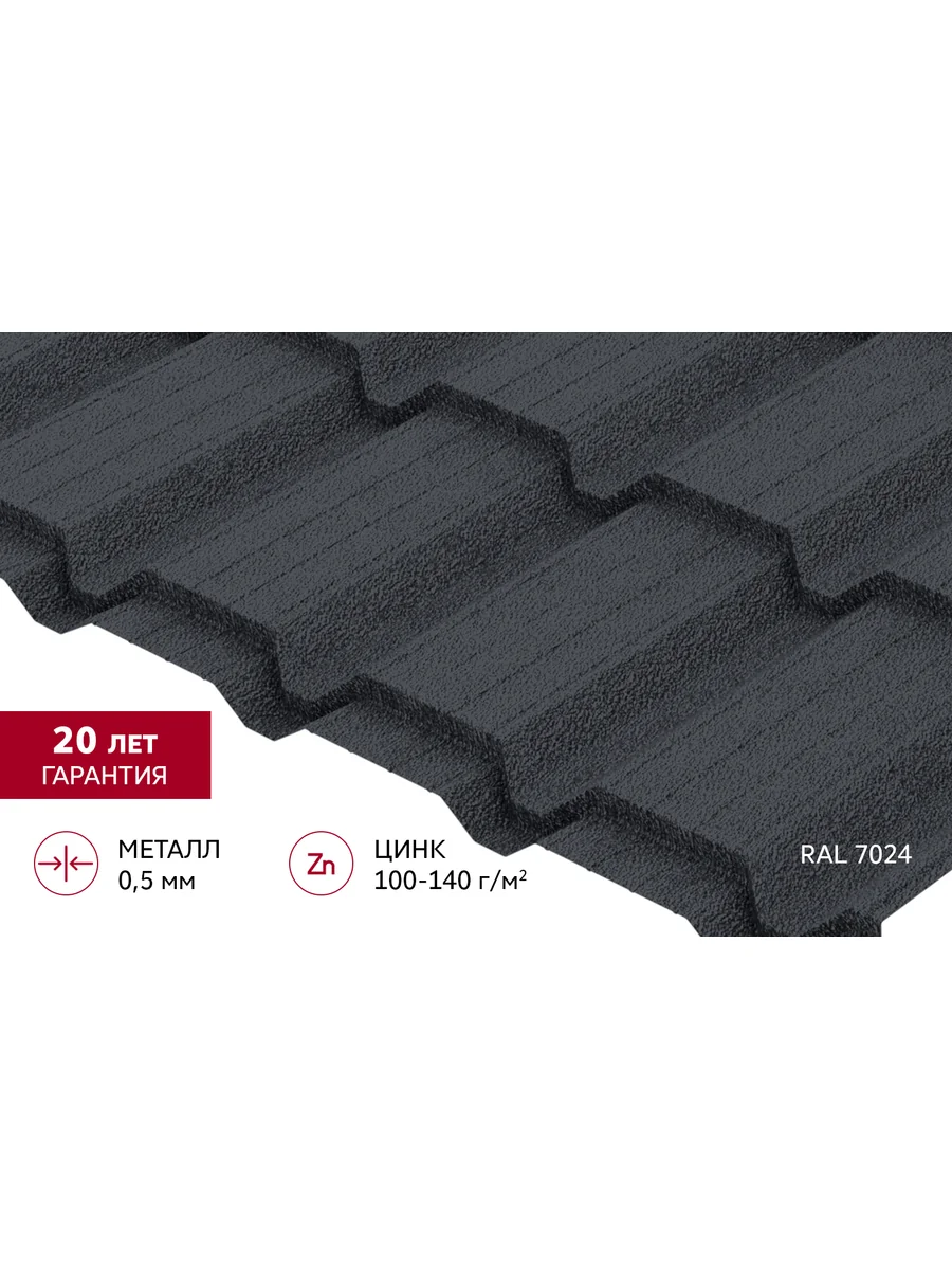 2. Эстетичный внешний вид: цвет RAL 7024 мокрый асфальт придаёт кровле современный и элегантный вид, который гармонично сочетается с любым архитектурным стилем.