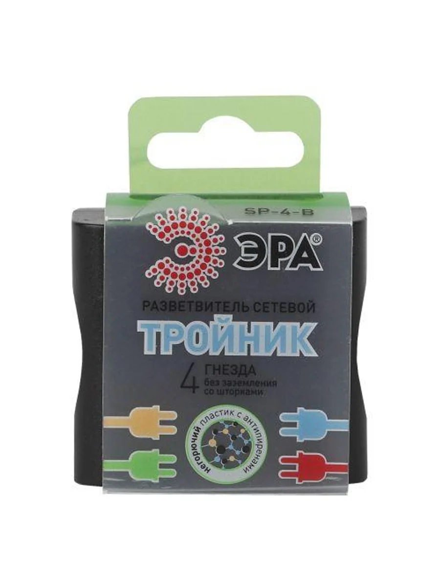 Разветвитель электрический Эра SP-4-B без заземления, 4 розетки, черный. Если в Вашем доме недостаточно розеток, чтобы одновременно подключить несколько электроприборов, то тройник марки Эра станет Вашим надежным помощником. Электрический разветвитель рассчитан на максимальную мощность 16А/3500Вт. Корпус выполнен из ударопрочного и негорючего пластика (поликарбонат). Модель тройника на 16А позволяет подключить мощные бытовые приборы общей нагрузкой до 3500Вт. Не бойтесь включить чайник, обогреватель или микроволновку. Дизайн разработан в России командой Эра Style.
