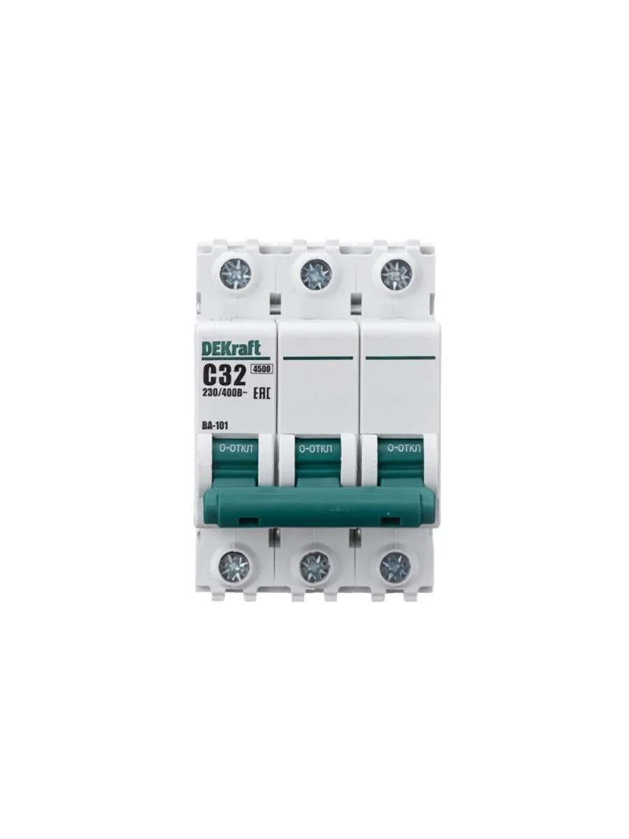Автоматический выключатель серии ВА-101 Dekraft; 3P; номинальный ток 32 А; характеристика С; отключающая способность 4,5 кА. 5 монолитных заклепок повышают прочность корпуса аппарата. Сплошная лицевая панель обеспечивает безопасность эксплуатации аппарата. Боковые каналы охлаждения повышают стабильность работы при высоких температурах окружающей среды. Есть возможность установки дополнительных аксессуаров с левой стороны устройства. Аппарат на 100% совместим с корпусами Dekraft и Systeme Electric.