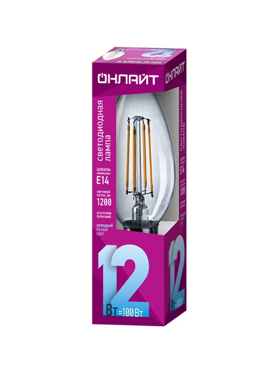 Лампа светодиодная филаментная 80 897 OLL-F-C35-12-230-4K-E14 12Вт свеча прозрачная 4000К нейтр. бел. E14 1200лм 220-240В ОНЛАЙТ 80897 - купить в KeepBuilding | KeepBuilding