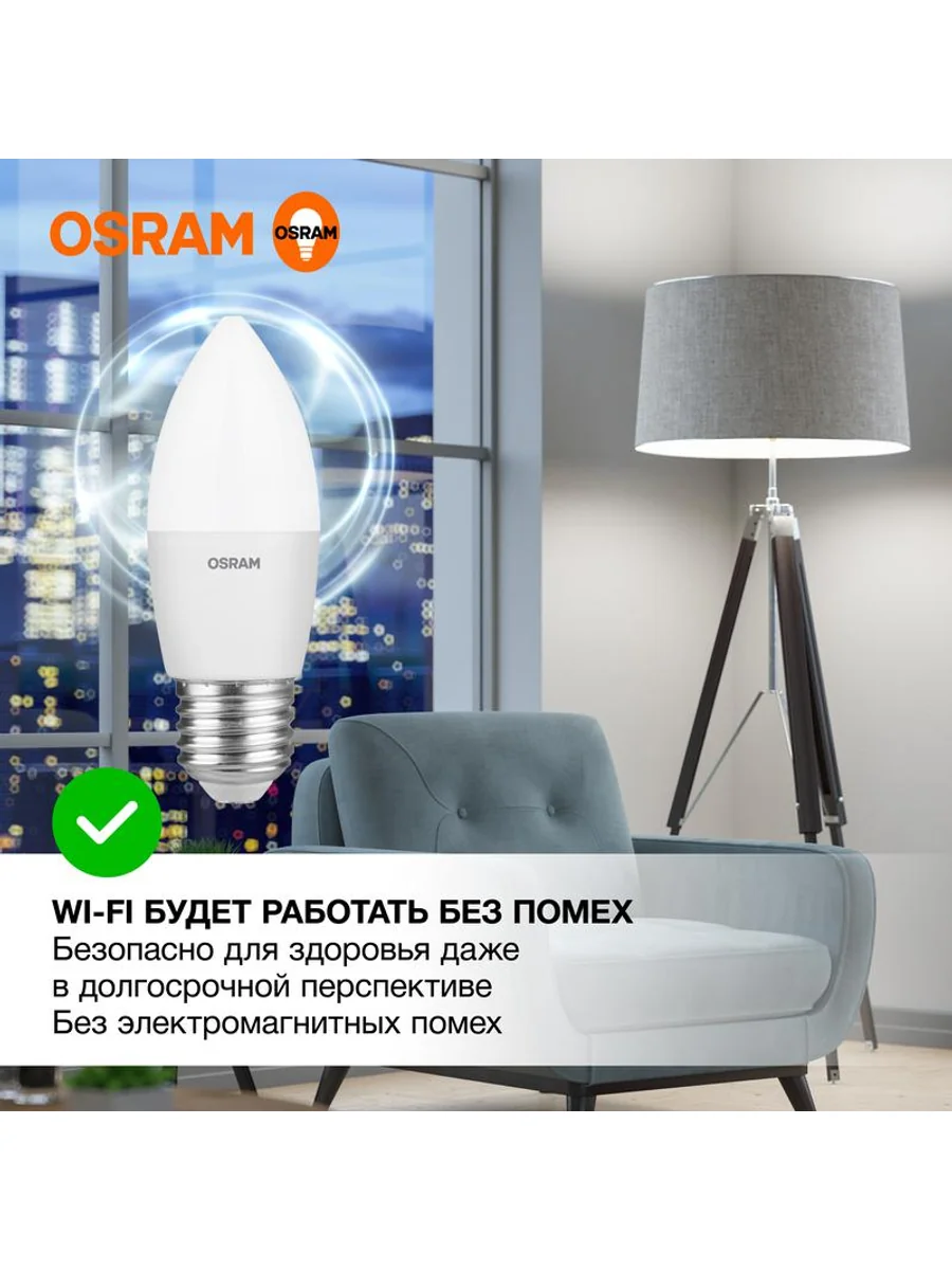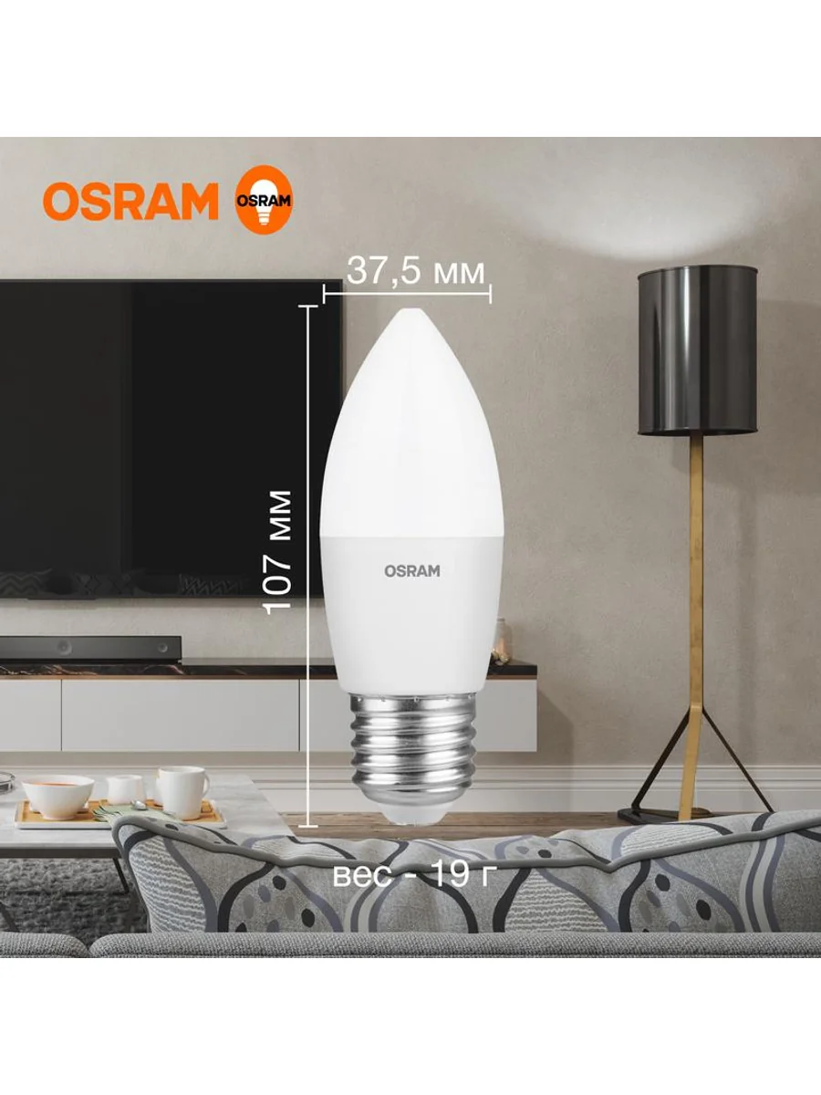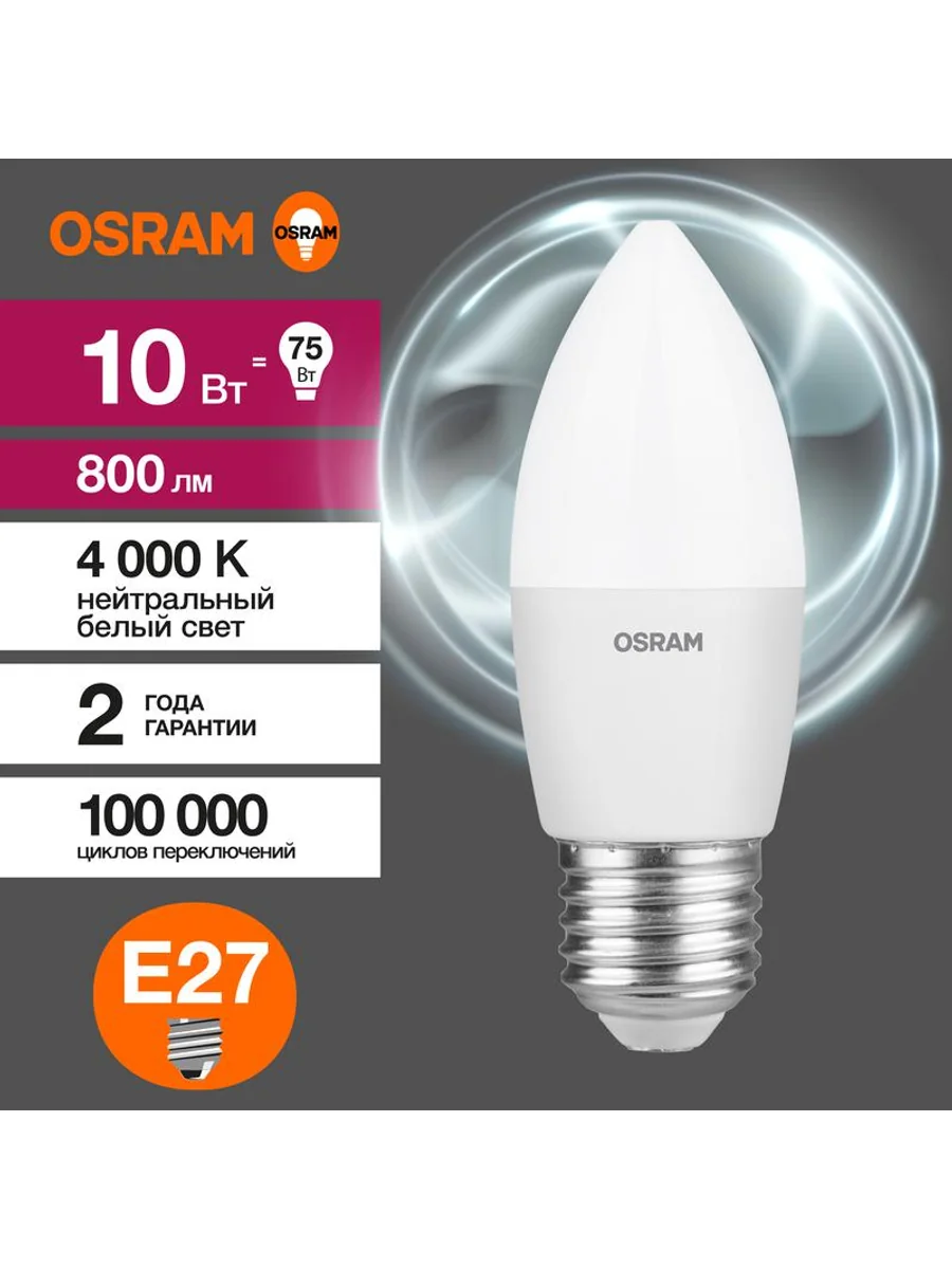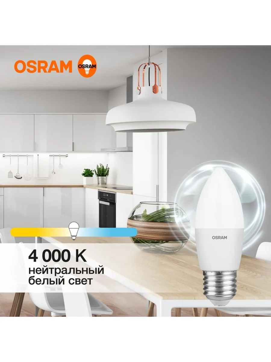Светодиодные лампы OSRAM - разумная замена традиционным лампам накаливания или галогенным лампам. Светодиодные лампы OSRAM снижают затраты на освещение до 90% при сохранении привычного уровня освещенности. Эта лампа OSRAM серии LED Value выполнена в форме колбы B ("свеча") с цоколем E27. Материал колбы - пластик, исполнение - матовое. Световой поток 800 люмен, что соответствует лампе накаливания на 75 Вт. Такие лампы применяются для внутреннего освещения, хотя в закрытом светильнике можно использовать и на улице. Эта лампа излучает нейтральный белый свет, угол пучка - широкий. Качество света на высоте: низкие пульсации защищают глаза, а высокий индекс цветопередачи позволяет видеть мир в его истинном цвете. Кроме того, лампы OSRAM полностью безопасны для здоровья, поскольку в них нет опасных материалов по европейскому стандарту RoHS, а также они не производят вредных электромагнитных излучений, что подтверждено ЭМС (сертификат электромагнитной совместимости). Лампа проработает долго: срок службы - 25000 часов, 2 года гарантии. Светодиодные лампы OSRAM - умный выбор для здоровья семьи и кошелька!