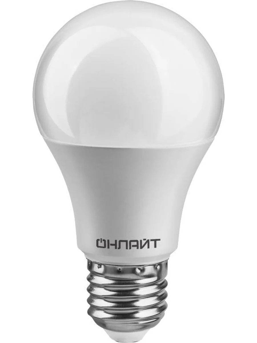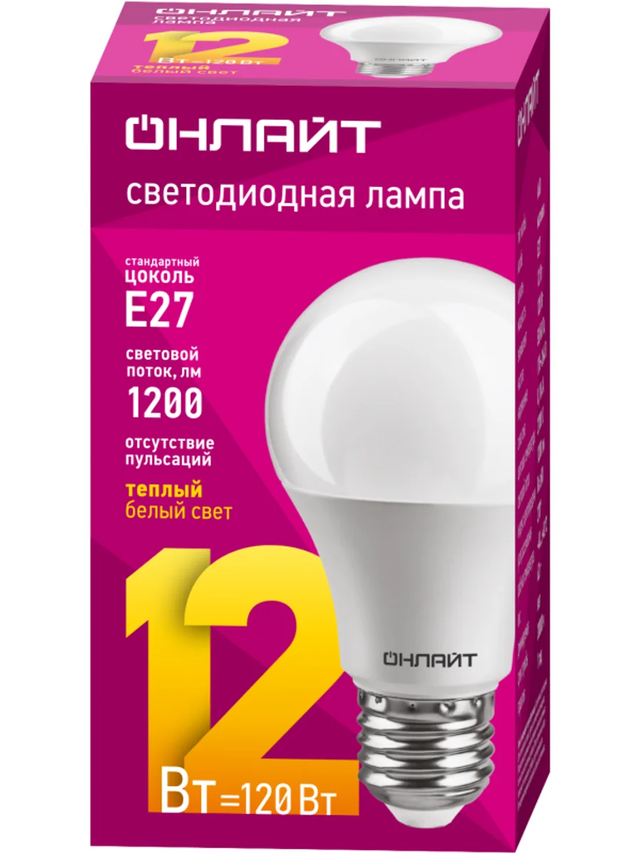 Лампа светодиодная 71 682 OLL-А60-12-230-2.7K-E27 ОНЛАЙТ 4670004716823 – лампа с колбой вида "шар", теплого белого света, длиной 126 мм, с цоколем Е27, мощностью 12 Вт. Цветовая температура 2700 К.