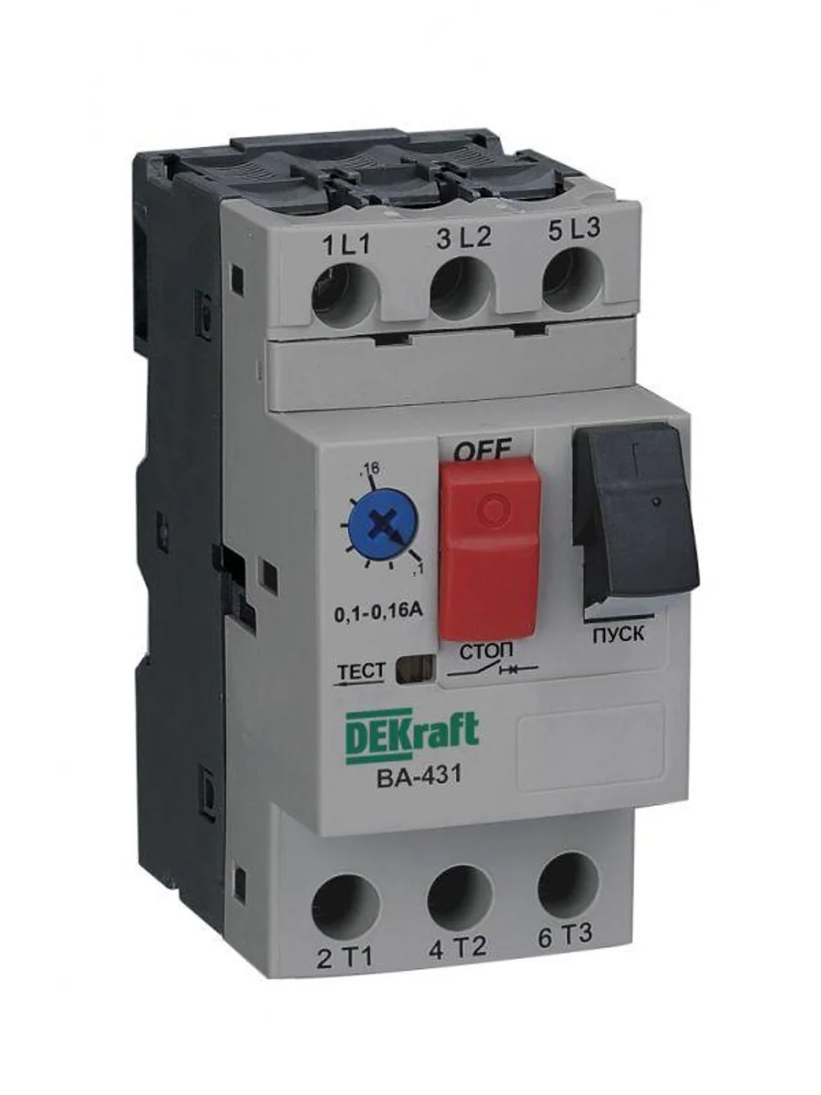 Автоматический выключатель серии ВА-431 Dekraft; диапазон уставок тока 4,0 - 6,3 А; ном. раб. напряжение 690 В; сечение подключаемых проводников 1,0 - 6,0 кв. мм. Корпус устройства изготовлен из самозатухающей пластмассы. Автоматические выключатели защиты двигателя серии ВА-431 Dekraft предназначены для управления и защиты трехфазных асинхронных электродвигателей от короткого замыкания, перегрузки и выпадения фазы. Дополнительно доступен ряд аксессуаров, облегчающих работу с устройством.
