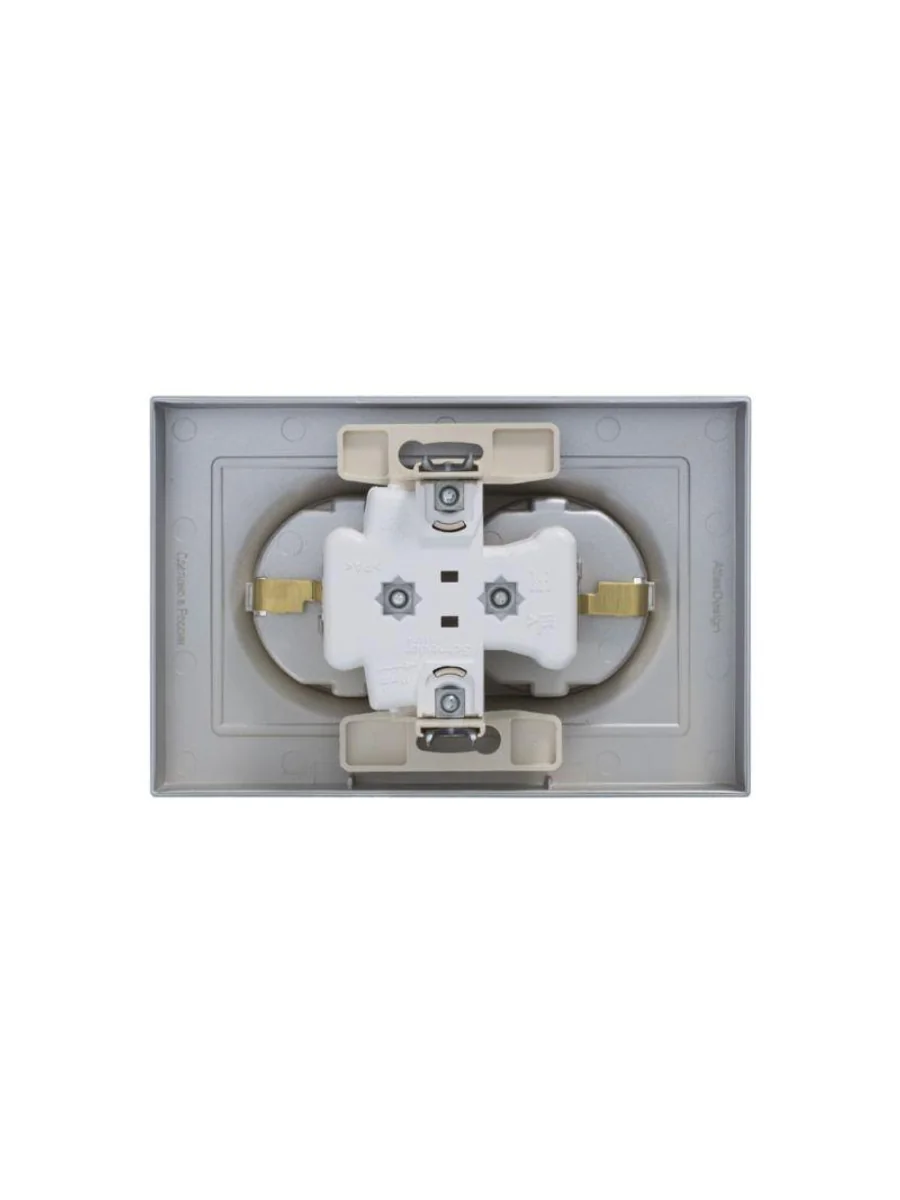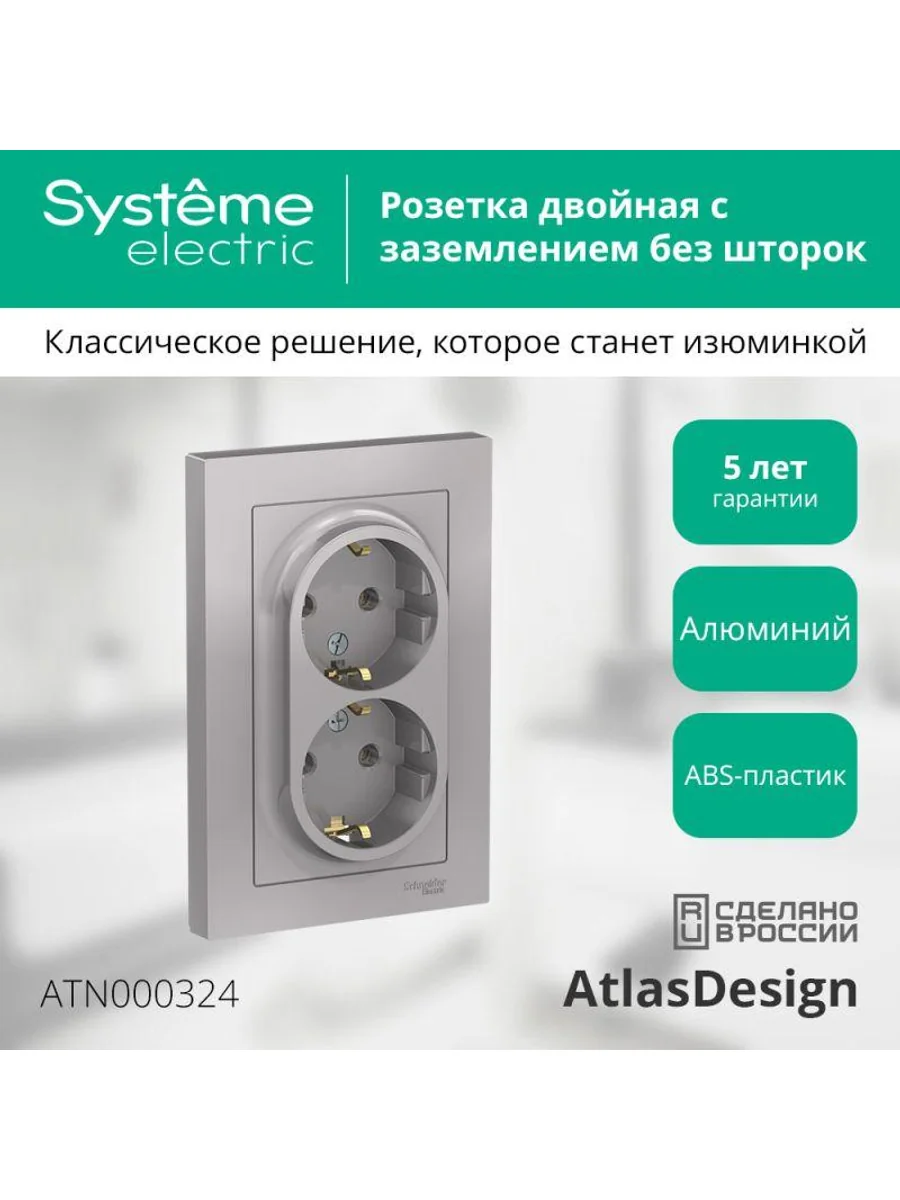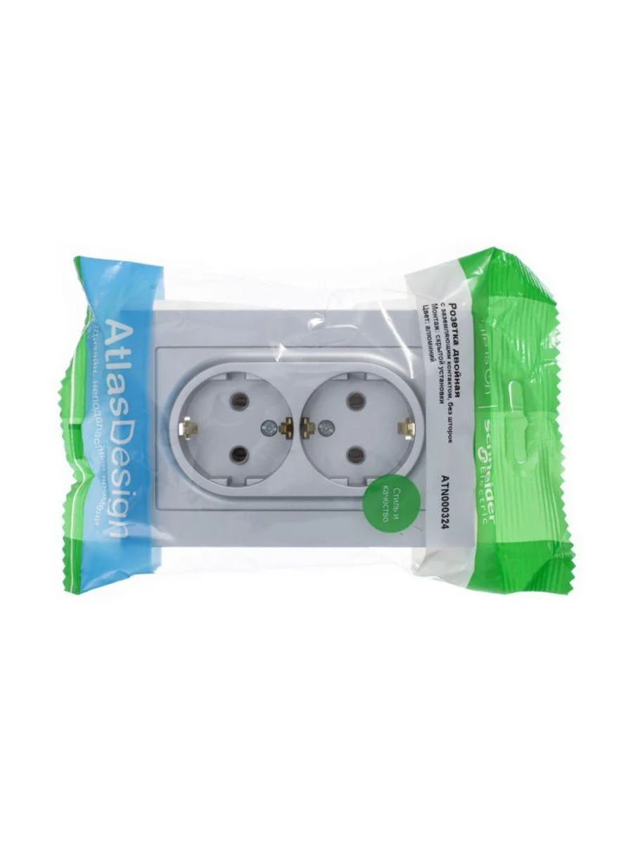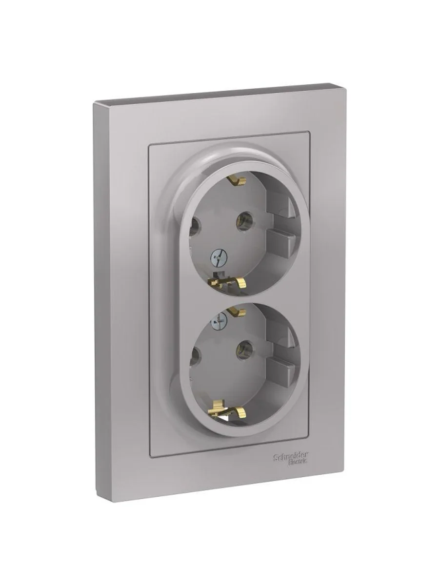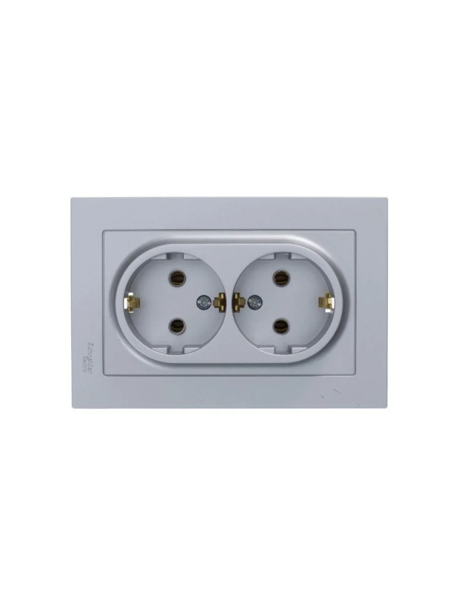 Розетка двойная в сборе Systeme Electric (ранее Schneider Electric) серии AtlasDesign в цвете алюминий с заземлением, без шторок подходит для сетей 250 В, на ток 16 А. Заземляющий контакт обеспечивает дополнительную защиту от удара электрическим током. Лицевые детали из качественного ABS-пластика, устойчивого к царапинам и УФ-излучению. Двойная розетка позволяет подключить два устройства в одном месте. Изделие поставляется в комплекте с рамкой того же цвета.