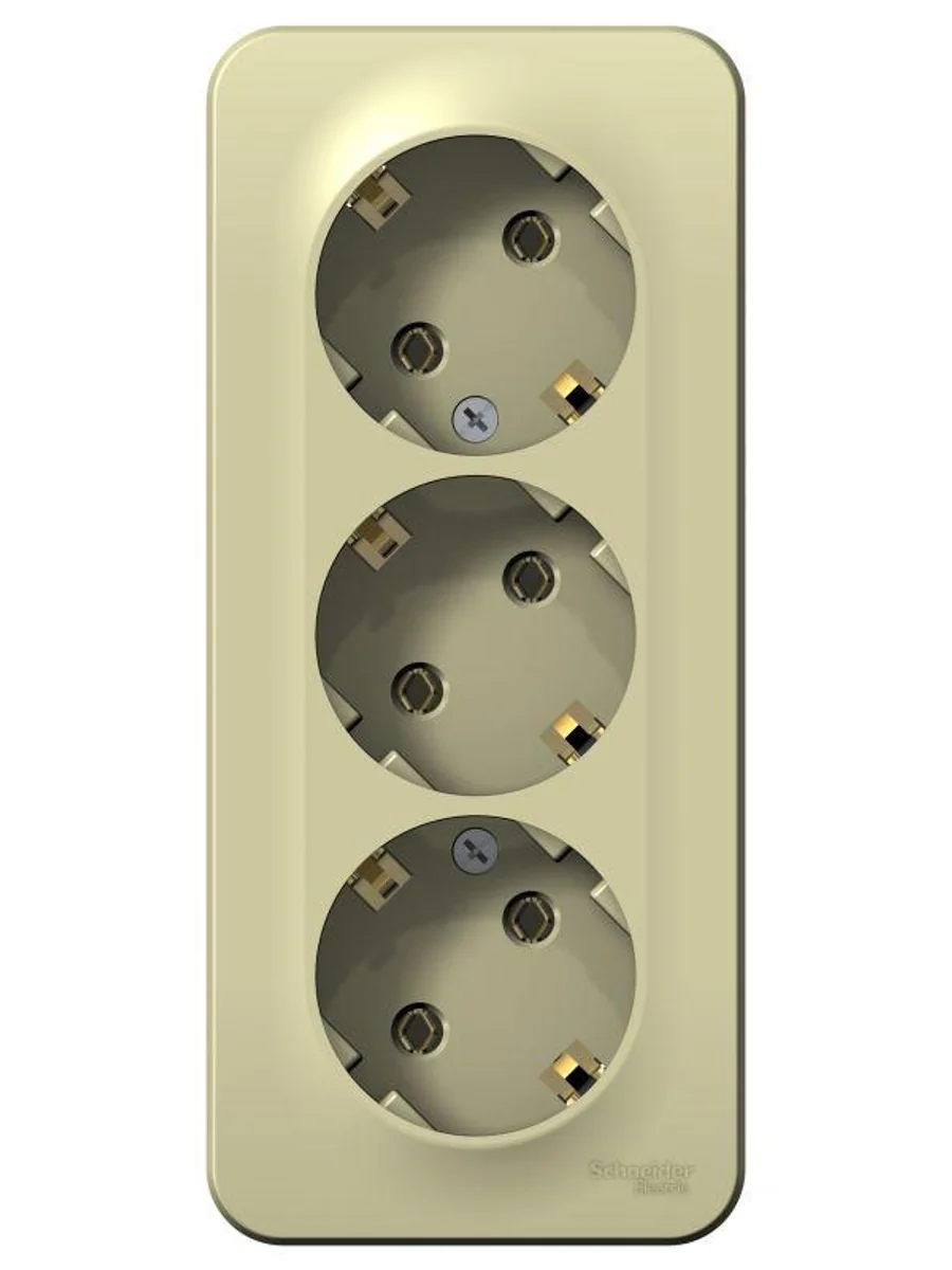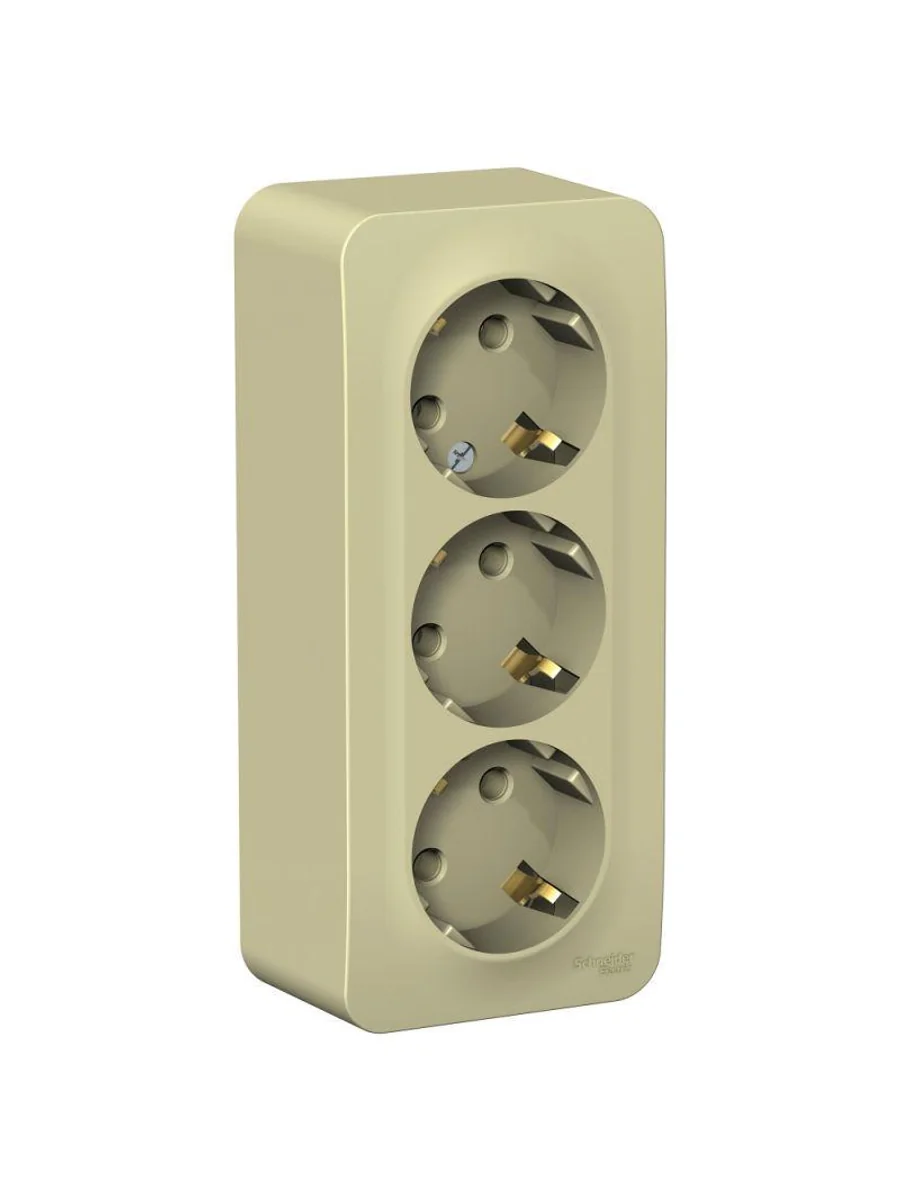 Розетка Systeme Electric (ранее Schneider Electric) BLANCA (открытой установки, цвет бежевый) трёхместная с заземлением без шторок, с изолирующей пластиной подходит для сетей 250 В, на ток 16 А. Заземляющий контакт обеспечивает дополнительную защиту от удара электрическим током. Входные отверстия расположены под углом 45 градусов, благодаря чему можно подключить несколько устройств: вилки и адаптеры не будут мешать друг другу. Корпус изделия выполнен из ABS-пластика.