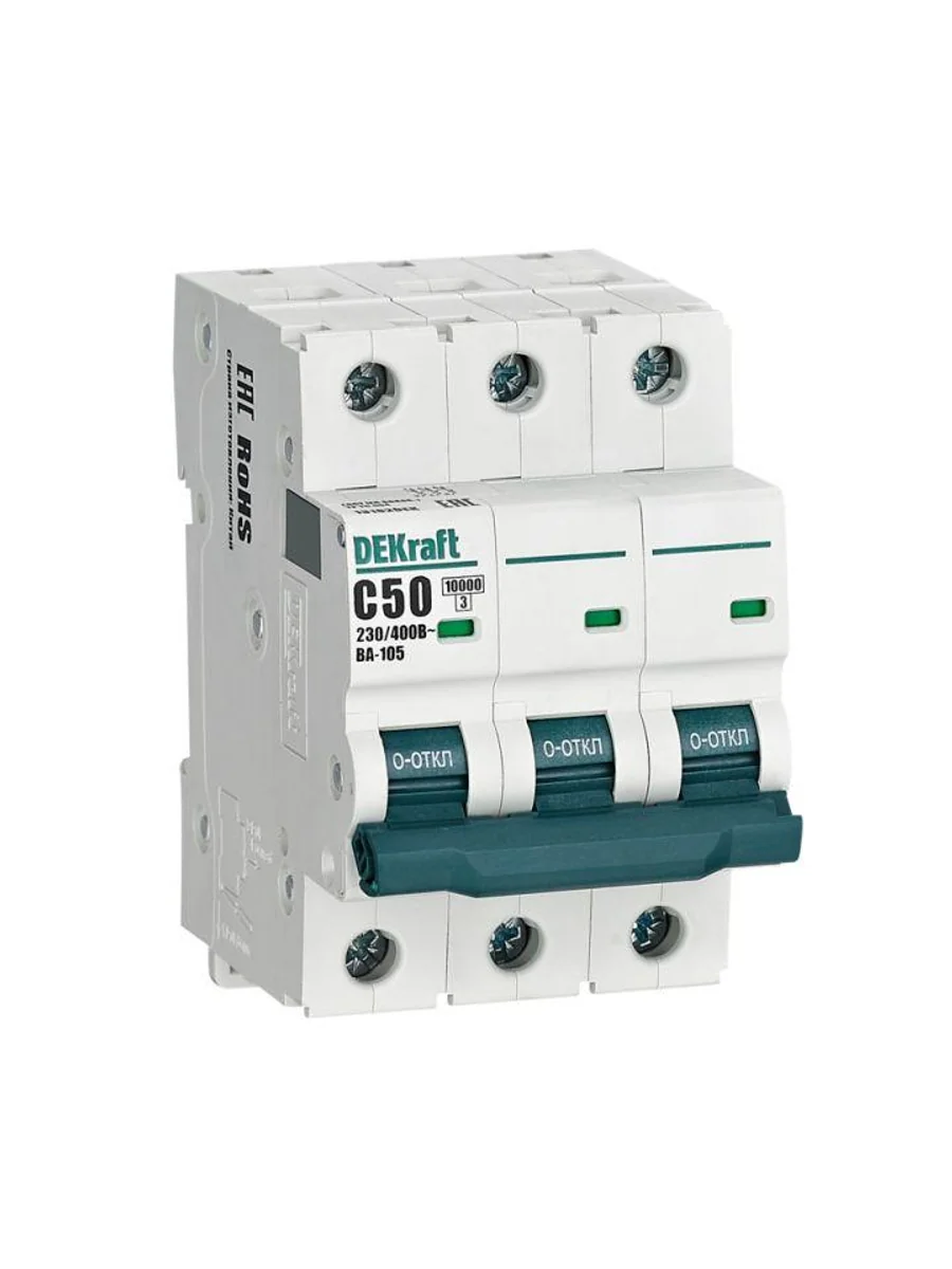 Автоматический выключатель серии ВА-105 Dekraft; 3P; ном. ток 50 А; характеристика C; откл. способность 10 кА; ширина модуля 18мм. Аппараты имеют механизм мгновенной коммутации, 6 монолитных заклепок, которые повышают прочность корпуса. Боковые каналы охлаждения повышают стабильность работы при высоких температурах окружающей среды. Есть возможность установки дополнительных аксессуаров с левой стороны устройства. Аппарат на 100% совместим с корпусами и оболочками Dekraft и Systeme Electric.