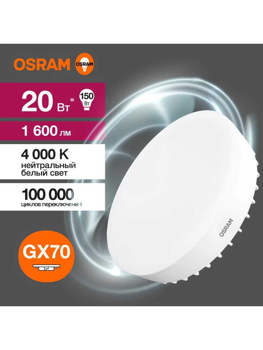 Светодиодные лампы OSRAM - разумная замена традиционным лампам накаливания или галогенным лампам. Светодиодные лампы OSRAM снижают затраты на освещение до 90% при сохранении привычного уровня освещенности. Эта лампа OSRAM серии LED Value выполнена в форме колбы GX с цоколем GX70. Материал колбы - пластик, исполнение - матовое. Световой поток 1600 люмен, что соответствует лампе накаливания на 150 Вт. Такие лампы обычно используют для потолков; обязательно проверьте совместимость со светильником. Эта лампа излучает нейтральный белый свет, угол пучка - узкий. Качество света на высоте: низкие пульсации защищают глаза, а высокий индекс цветопередачи позволяет видеть мир в его истинном цвете. Кроме того, лампы OSRAM полностью безопасны для здоровья, поскольку в них нет опасных материалов по европейскому стандарту RoHS, а также они не производят вредных электромагнитных излучений, что подтверждено ЭМС (сертификат электромагнитной совместимости). Лампа проработает долго: срок службы - 25000 часов, 2 года гарантии. Светодиодные лампы OSRAM - умный выбор для здоровья семьи и кошелька!