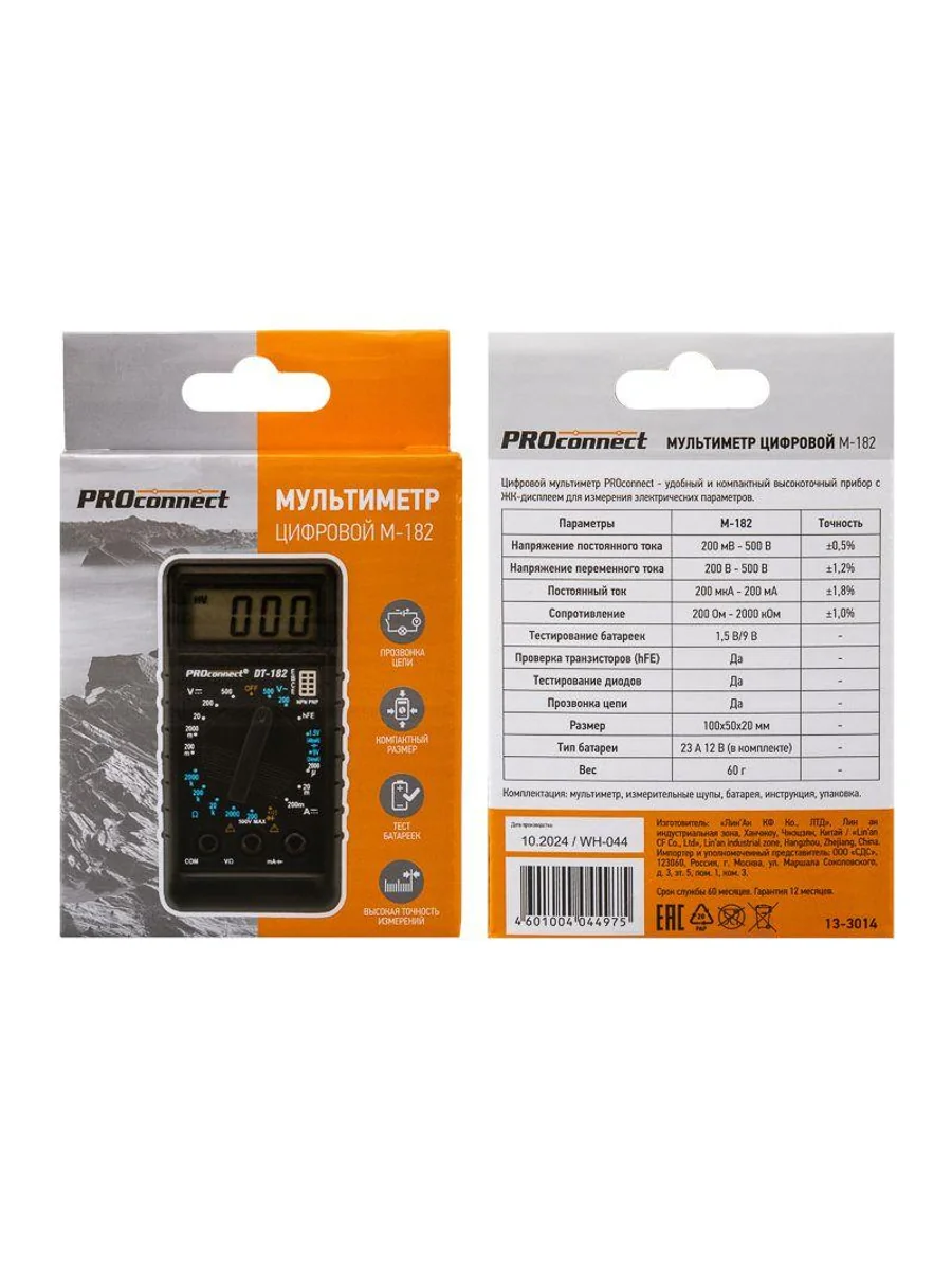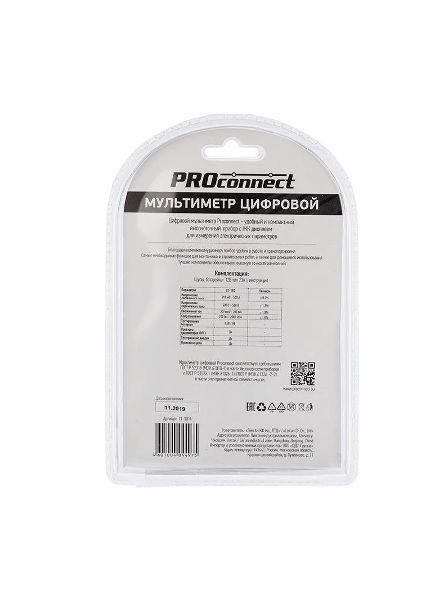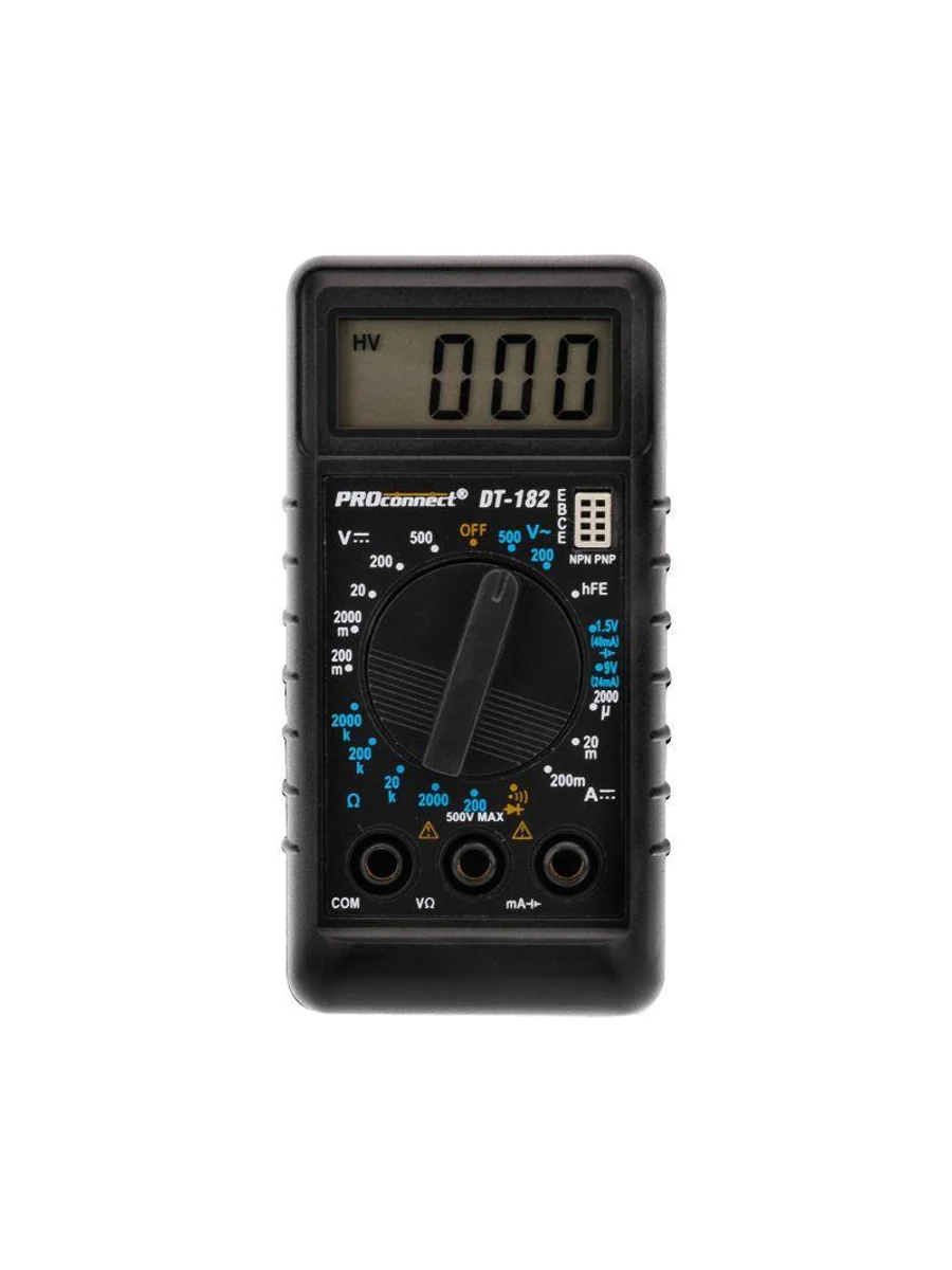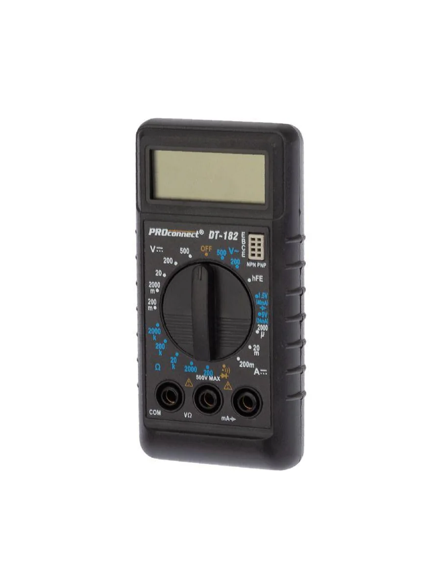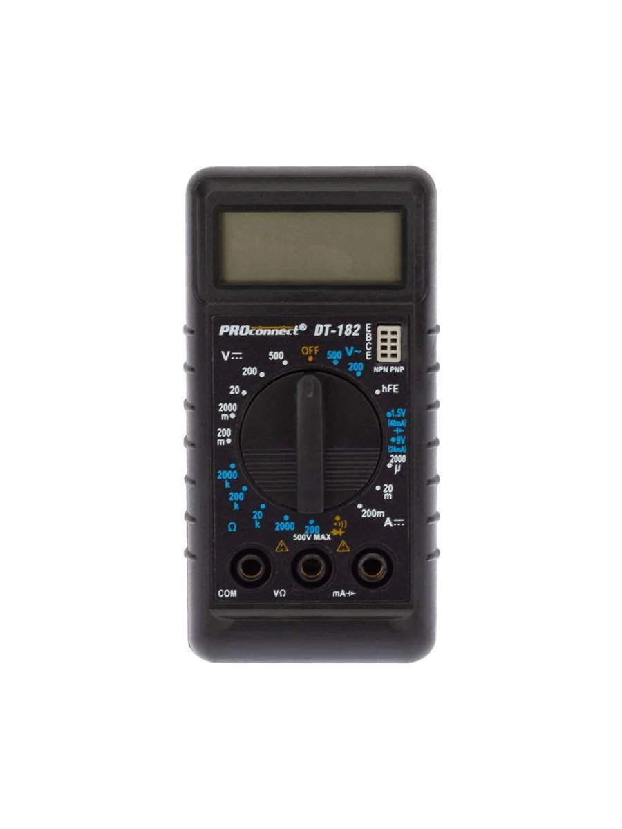 Мультиметр — электроизмерительный прибор, который включает в себя несколько функций и набор измеряемых параметров. Цифровой портативный мультиметр PROconnect DT-182 представляет собой субкомпактный 3,5-разрядный прибор, предназначенный для измерения постоянного и переменного напряжения, постоянного тока, сопротивления, проверки диодов, транзисторов, прозвонки соединений, а также проверки батареек. Самый компактный из приборов PROconnect. Прибор изготовлен из высококачественных материалов, калибровка и тестирование приборов произведены под контролем компании СДС. Характеристики: Постоянное напряжение: 200 mВ - 500 В (±0.5%) Переменное напряжение: 200 В - 500 В (±1,2% +10) Постоянный ток: 200 мкА - 200 мА (±1,8%) Сопротивление: 200 Ом/2000 КОм (±1,0%) Тестирование диодов Тестирование батареек Прозвонка цепи Проверка транзисторов (hFE) 3,5-разрядный дисплей Размер: 100х50х20 мм Тип батареи: 23 А 12 В (в комплекте) Вес: 60 г Комплектация: мультиметр, измерительные щупы, батарея, инструкция, упаковка.