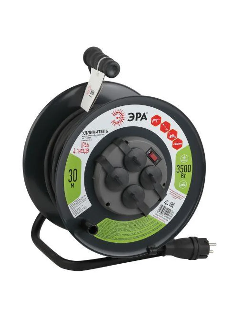 Удлинитель силовой на металлической катушке ЭРА RMx-4es-3x2.5-30m-IP44(KG) с заземлением, с выключателем, 4 розетки, 30м, КГ 3x2,5мм2, IP44, 16А / 3500Вт, оснащен несколькими розеточными гнездами для возможности подключения одновременно до 4 электроприборов на удаленном расстоянии от стационарной розетки. Данная модель удлинителя на катушке подойдет для использования на даче, на строительной площадке, в производственных цехах и пр. Характеристики провода КГ позволяют работать с удлинителем в широком диапазоне температур (от -40 градусов до +50 градусов по Цельсию), что подойдет для любого времени года.