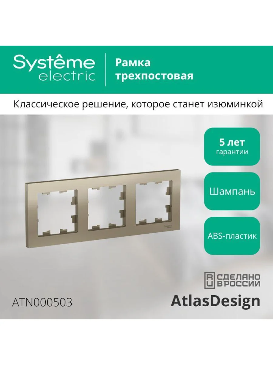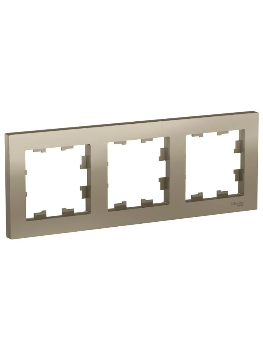 Рамка Systeme Electric (ранее Schneider Electric) серии AtlasDesign в цвете шампань трёхместная. - Устанавливается в вертикальном и горизонтальном положениях. - Лицевые детали из качественного ABS-пластика, устойчивого к царапинам и УФ-излучению. - Позволяет гармонично вписать электроустановочное изделие в интерьер помещения.